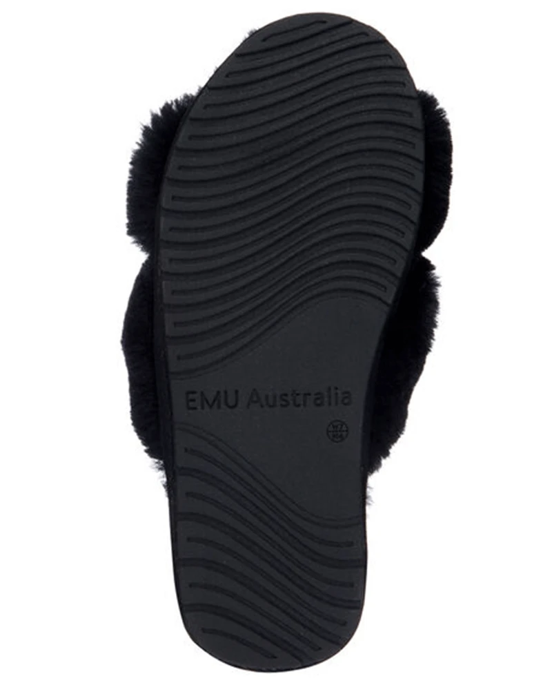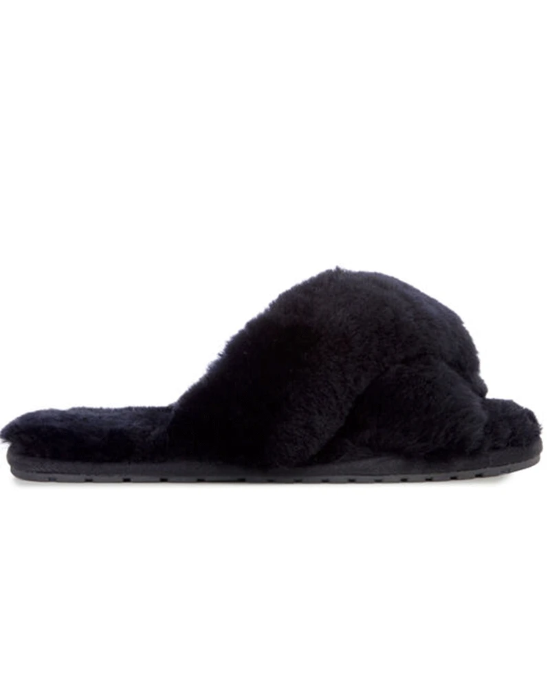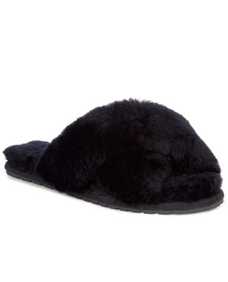 EMU Mayberry Black Slippers, a cosy black slip on slider slipper with a flexible rubber slip resistant sole. Crafted from natural woolmark accredited sheepskin these Australian slippers are a practical everyday shoe that can be worn indoors or outdoors. The woolly insole gives cloud like comfort and warmth.