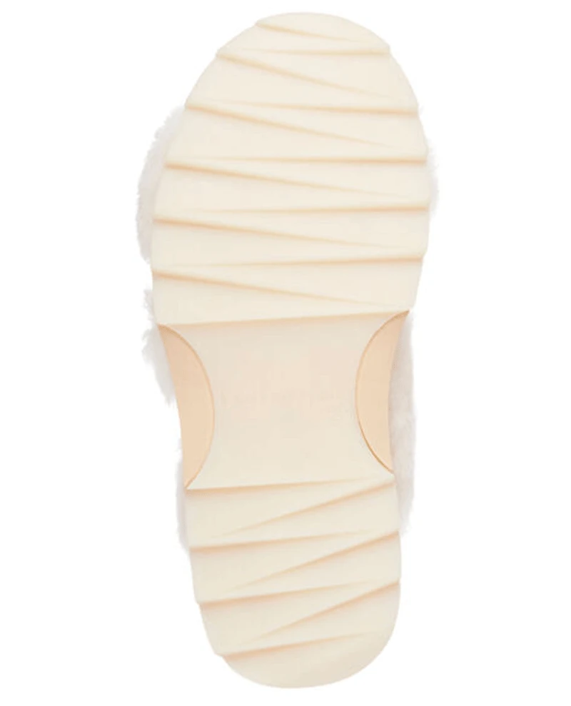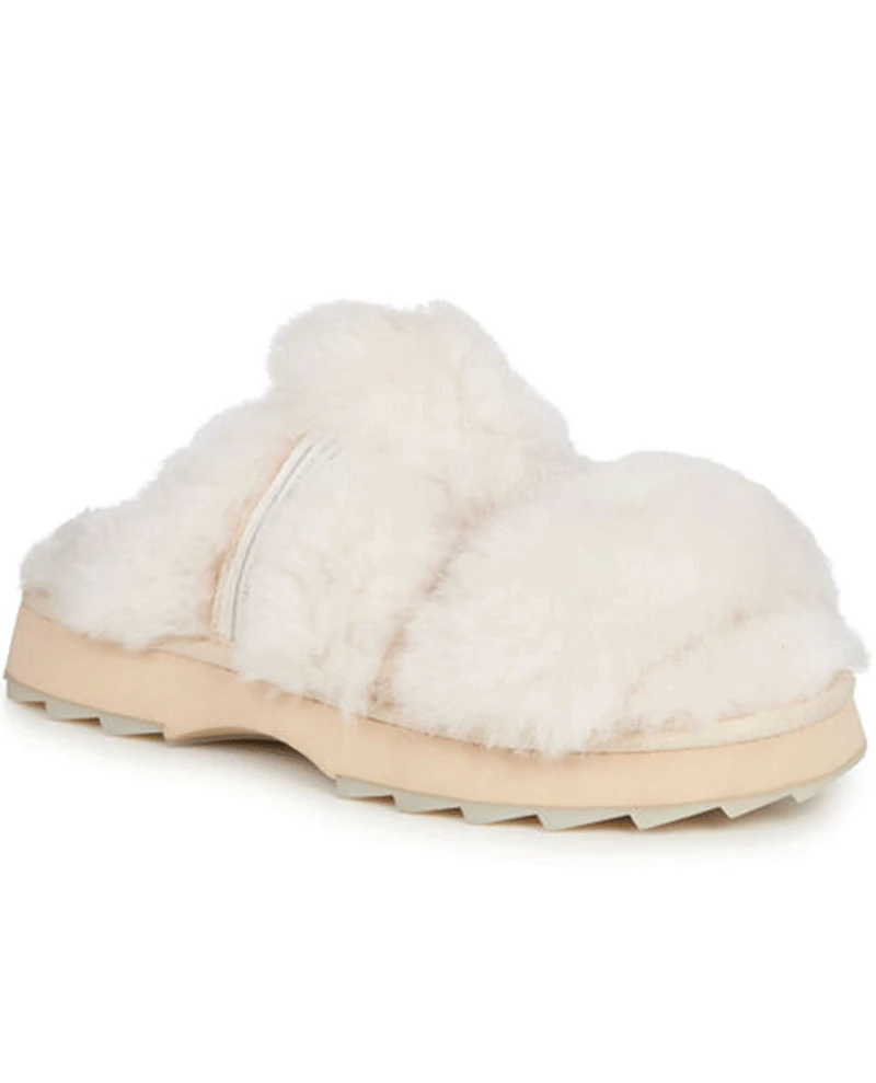 EMU Wobbegong Natural Slippers, a chunky and fluffy slip on slipper with two cream sheepskin straps. These slider slippers have a ridged rubber sole with foam inserts making them comfortable and suitable for wear inside or outside. Also available in black these cream sliders have an open toe.
