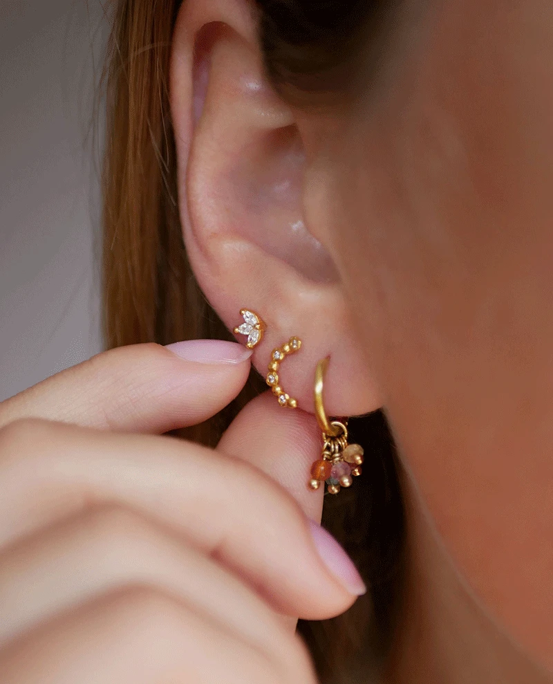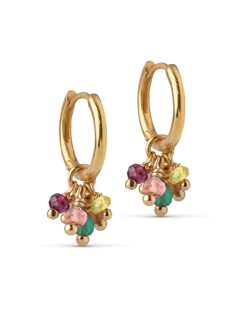 Enamel Copenhagen Adora Hoops, a shiny gold pair of small hoop earrings adorned with multi-coloured gem stone charms.