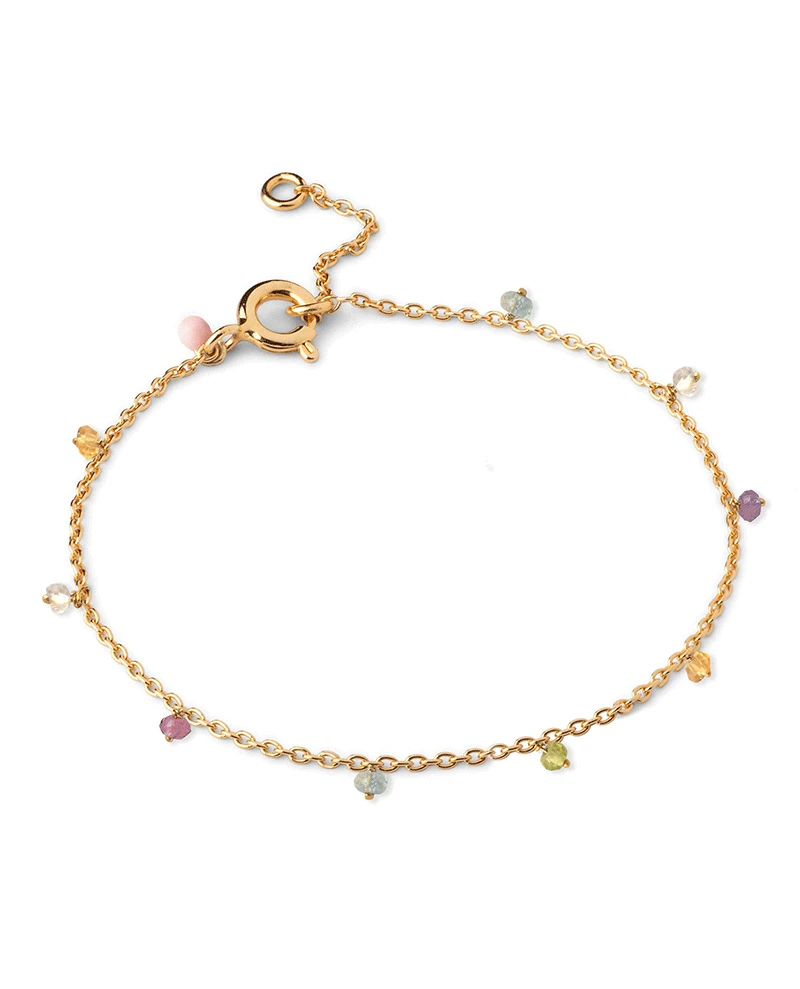 Enamel Copenhagen Feline Bracelet, a fine gold chain bracelet with a lobster claw closure and small multi-coloured gem charms.