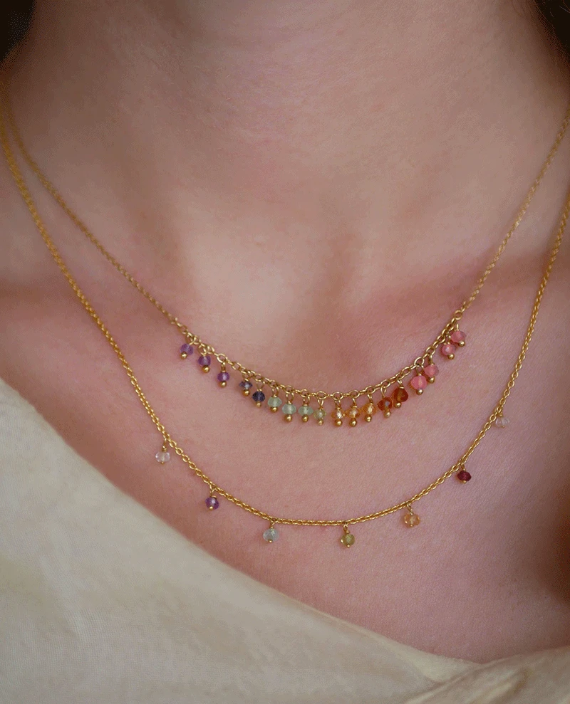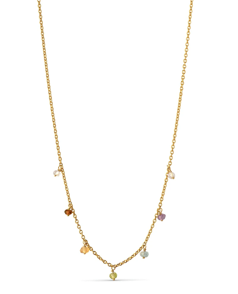 Enamel Copenhagen Feline Necklace, a fine gold chain necklace adorned with multi-coloured gem stone charm pendants.Â