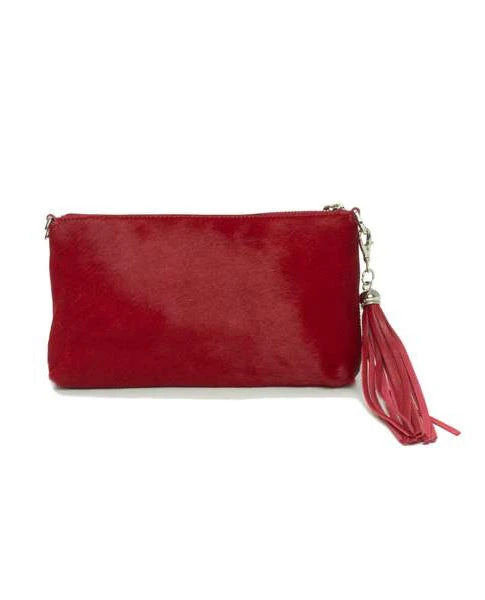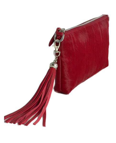 Fioriblu Forget Me Knot Clutch in Red, a beautifully slim and elegant handbag with detachable shoulder straps so that it can be worn across the body if desired. There are internal zipped pockets to carry essentials during the day or at night. This deep burgundy tassel accessory is a chic finishing touch to any outfit.