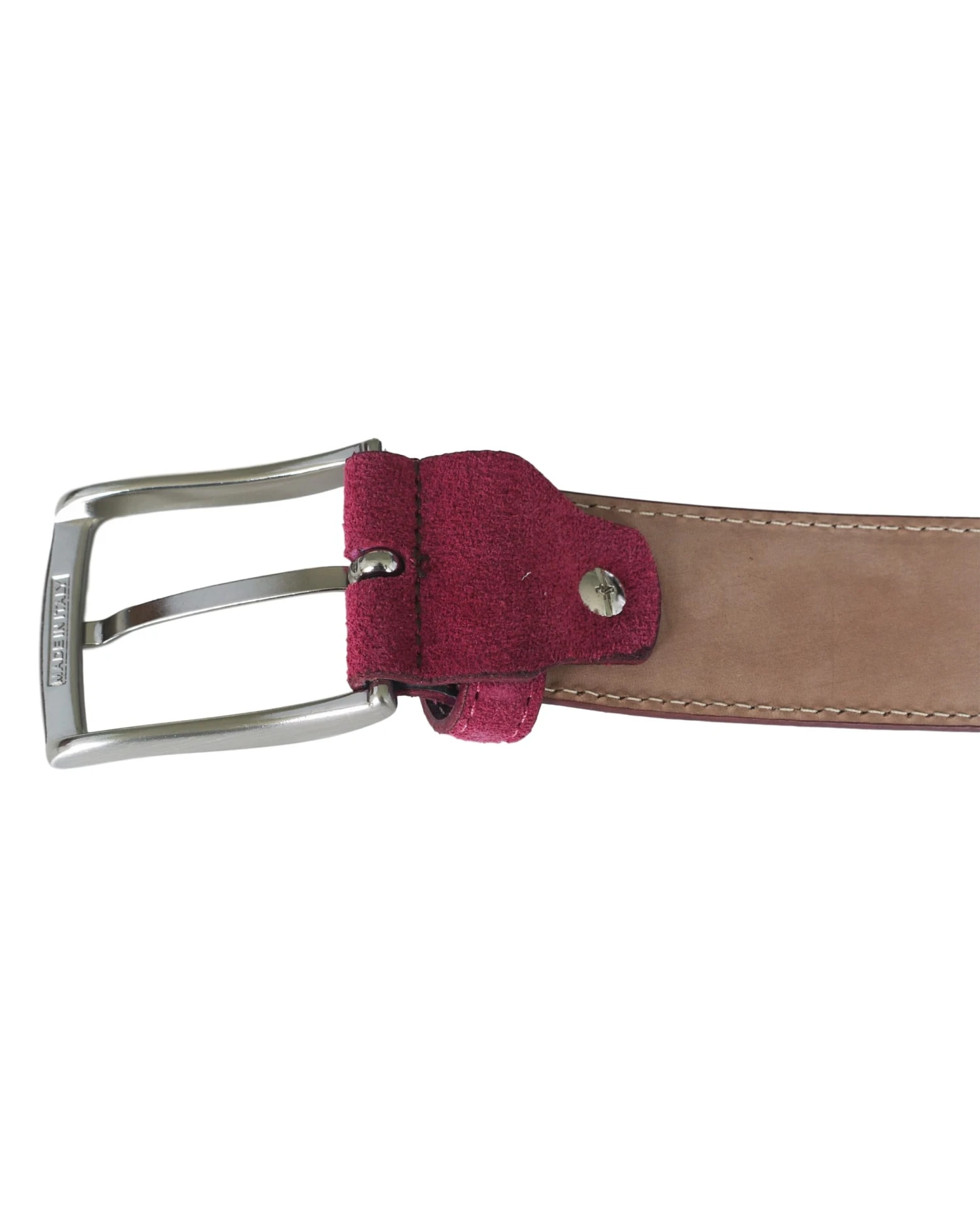Fioriblu Papavero Belt in Dark Red, a burgundy red velvety suede unisex belt handcrafted in Italy and finished with a square metal buckle.