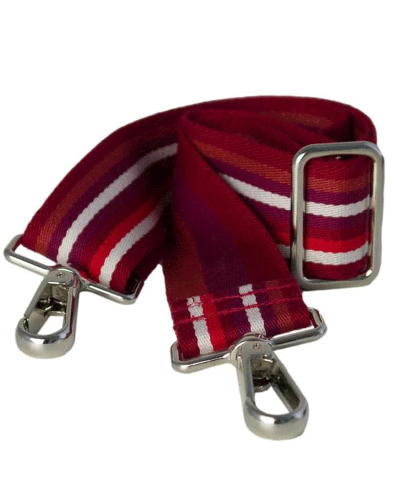 Fioriblu Red Stripy Bag Strap, a plum, red, burgundy and white striped bag strap with silver metal hooks. Fully adjustable this long stripy bag strap can be added to any bag to brighten it up.