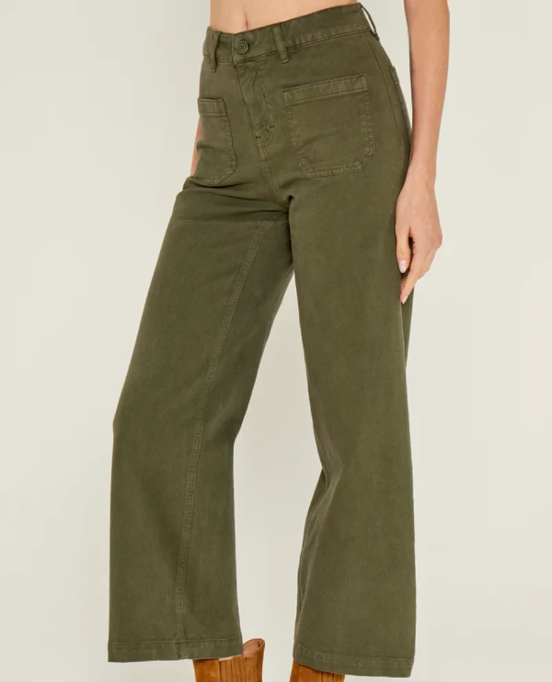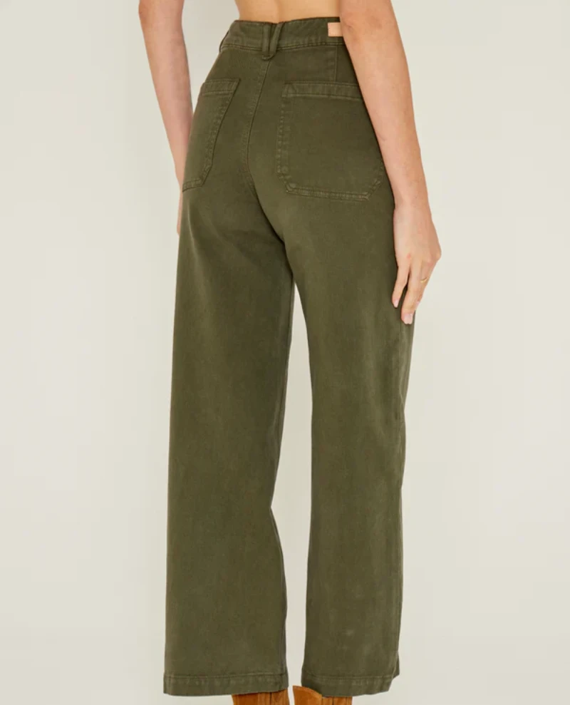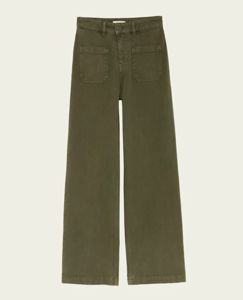 These Five Lucia Khaki Trousers offer a stylish, front-fastening design and pocket detail. The green flared legs and mid-to-high rise make for a flattering, comfortable fit. Perfect for any occasion.