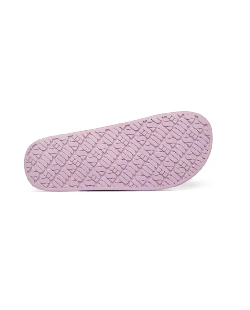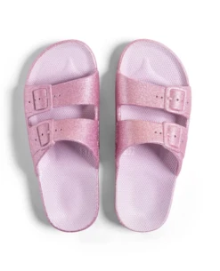 Freedom Moses Isla Glitter Parma Sandals, comfortable pink vegan slides which are injected with air for a comfortable fit, whether at the beach or on a city break. Moulded inner soles in a sustainable PCU with double buckle detailing to top.