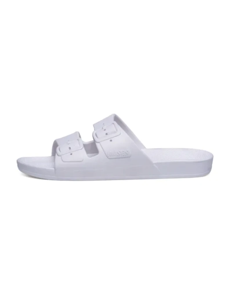 Freedom Moses White Sandals, comfortable white vegan slides which are injected with air for a comfortable fit, whether at the beach or on a city break. Moulded inner soles in a sustainable PCU with double buckle detailing to top.