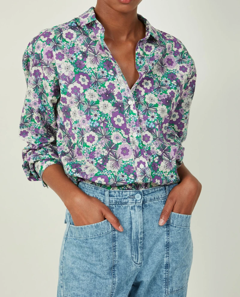Hartford Charlot Violet & Green Woven Shirt, a gorgeous printed shirt in violet and green tones. With long sleeves, button down front and classic collar, we love the Charlot paired with your favourite washed denim.