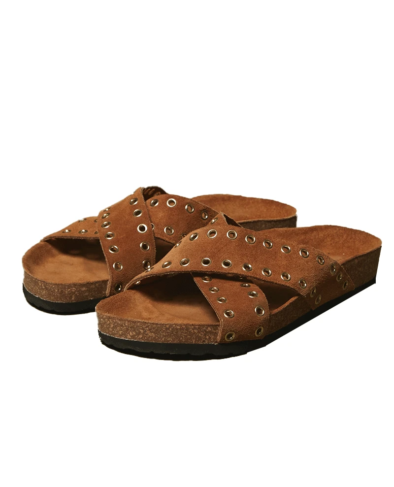 Hartford Edna Camel Sandals, a brown pair of suede sliders with criss cross straps and metal eyelets. The moulded cork soles offer support and rubber ads grip. A comfortable and stylish pair of Summer sandals that also come in green.