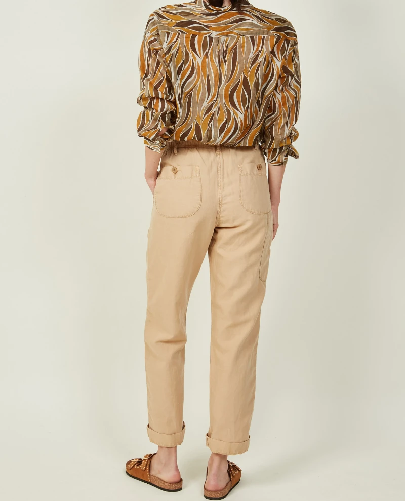 Hartford Paint Stone Woven Trouser, a woven straight leg pant in neutral stone tone. The Paint trouser has a slim, straight leg with classic front fastening and pocket detail. Dress up or down according to taste.
