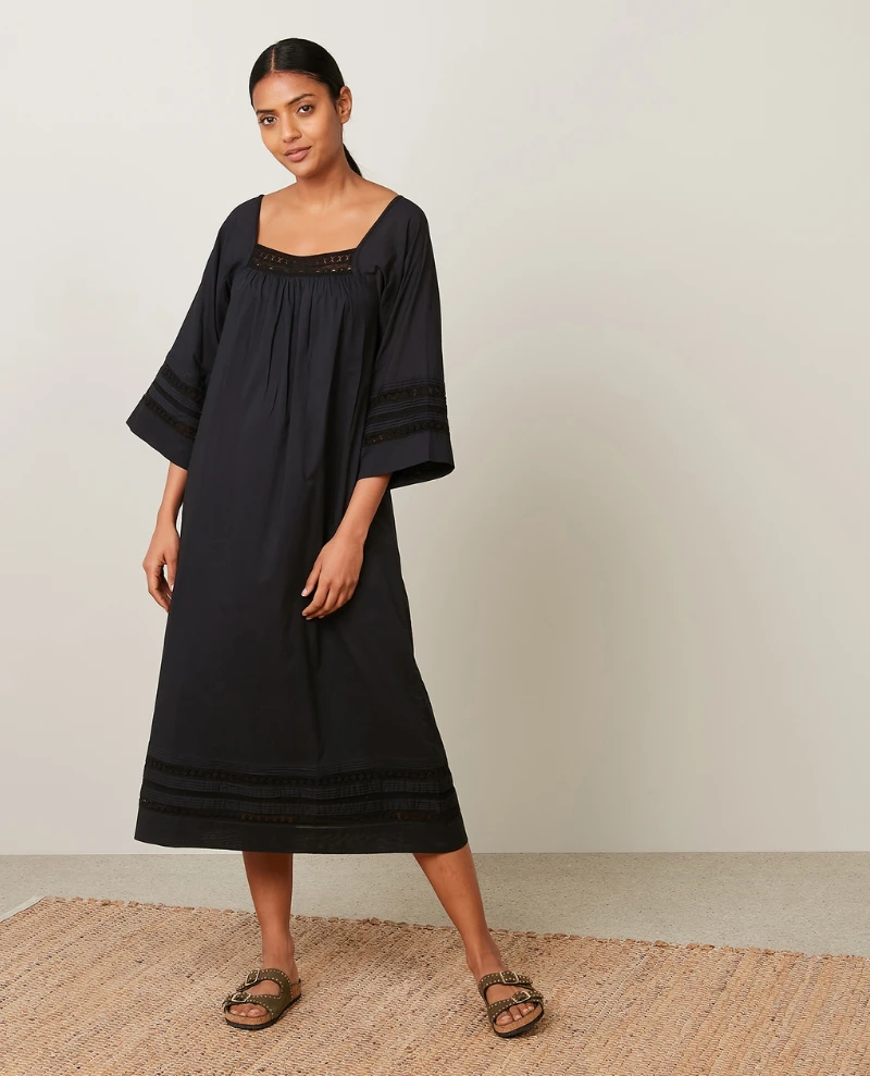 Hartford Ria Black Woven Dress, a lovely smock style dress in classic black. With squared neckline and wide, cropped sleeves, the Ria dress falls to the ankle with decorative tape detailing at the hem, sleeves and neckline.