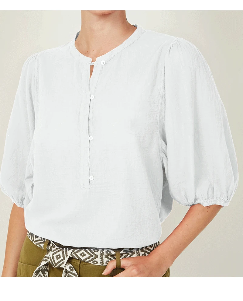 Hartford Turette White Blouse, a pure white cotton with voluminous half sleeves which are finished with elasticated hem. Complete with a simple round neck and four button fastening to the front.