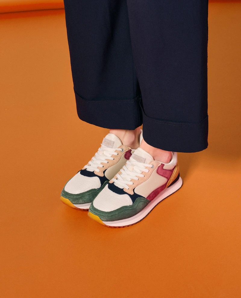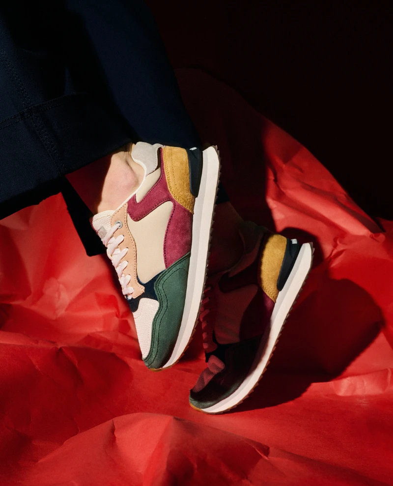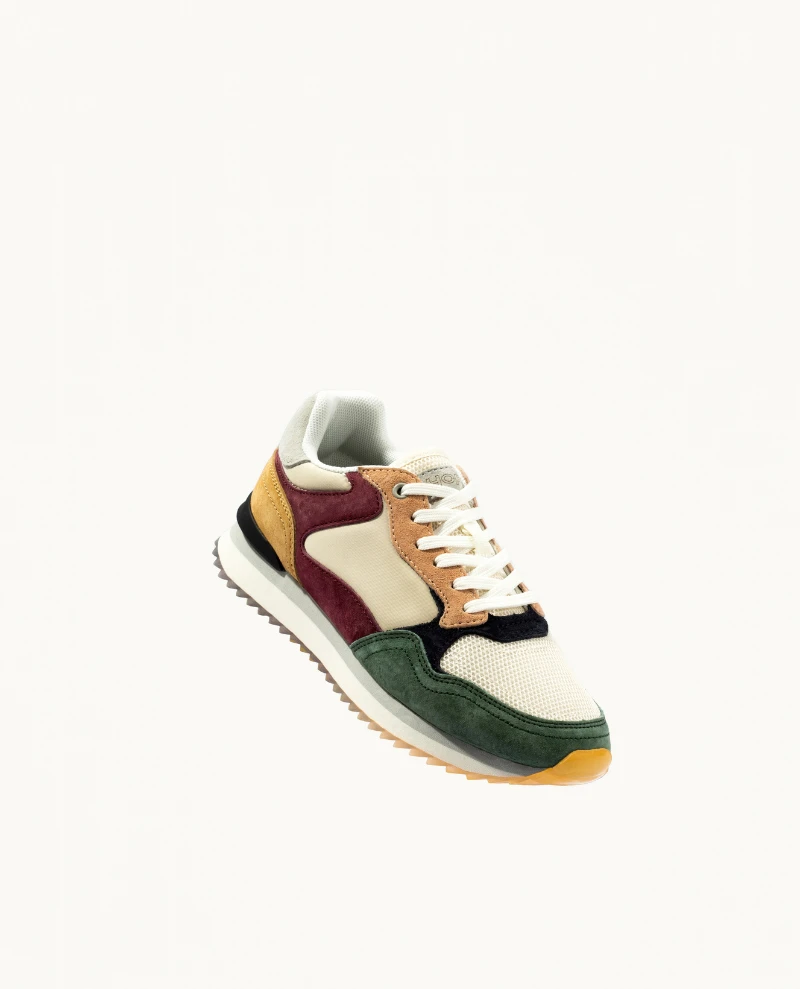Hoff Montreal Brown Trainers, multi-coloured pair of suede retro sneakers with a thick rubber sole and white laces. Retro inspired the Montreal training shoe has a heel stabiliser and the logo stamped on the heel and tongue. Made up from patches of burgundy, pink, mustard and green with flashes of black.