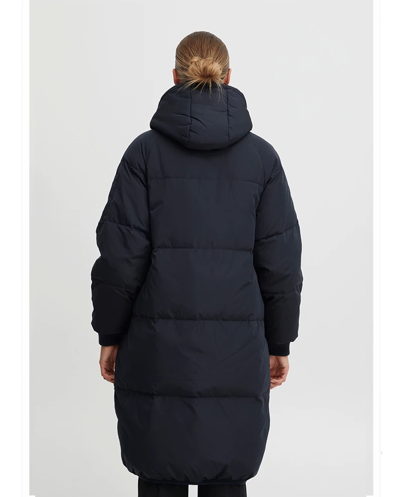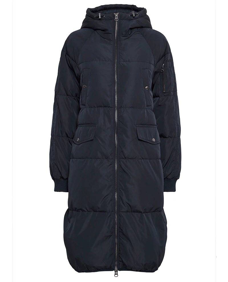 Ichi Bunala Navy Padded Jacket, a dark navy blue oversized Winter jacket with long sleeves and a hood. This knee length coat has 5 pockets and a tonal zip running down the front. Warm and practical for cold weather the Bunala jacket also comes in brown.Â