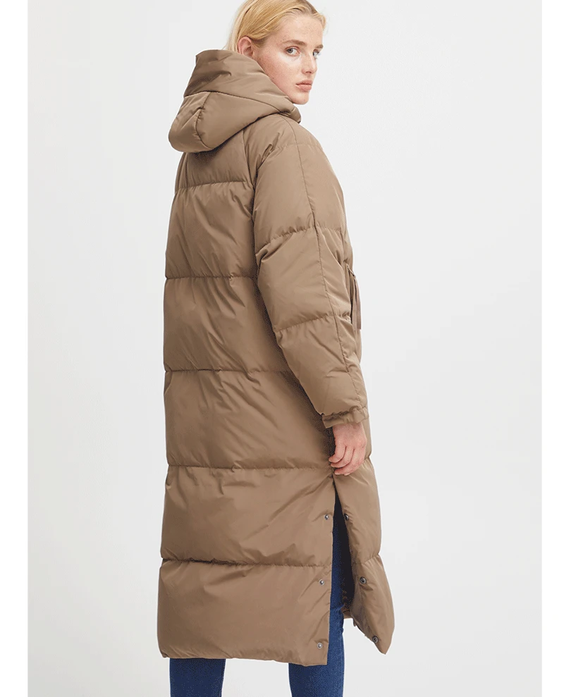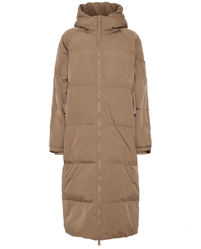 Ichi Bunala Shitake Padded jacket, a mushroom brown shower resistant puffer jacket with long sleeves and a hood. Fastening down the front with a tonal black zip, these warm Winter coat has poppers on the side seams at the hem adding a practical edge to this stylish neutral jacket.
