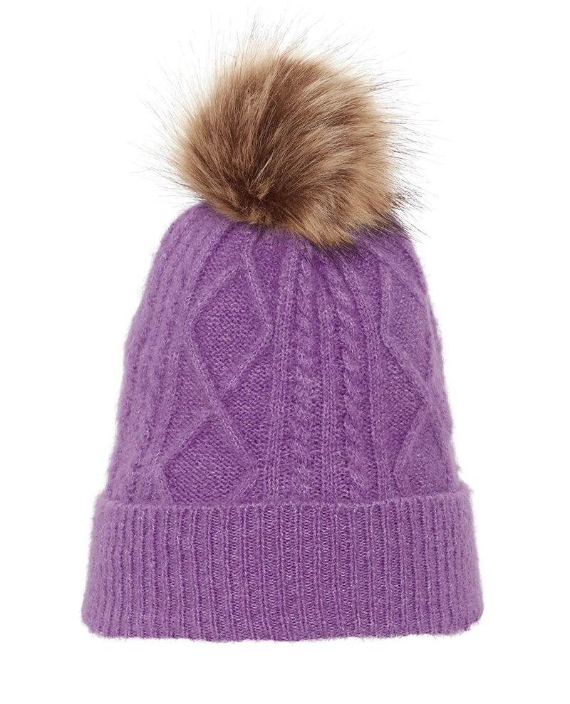 Ichi Cagri Lavender Bobble Hat, a lilac knitted hat with a brown faux fur bobble and a cable knit design. Also comes in oatmeal brown.