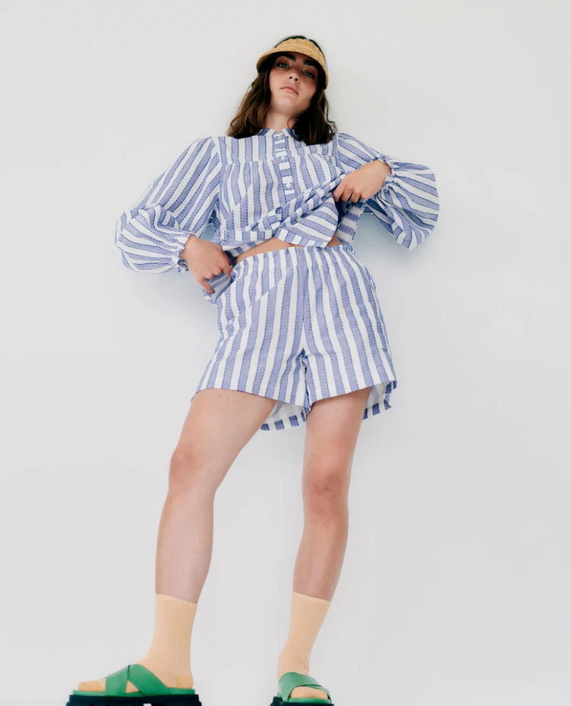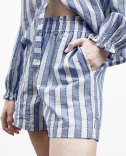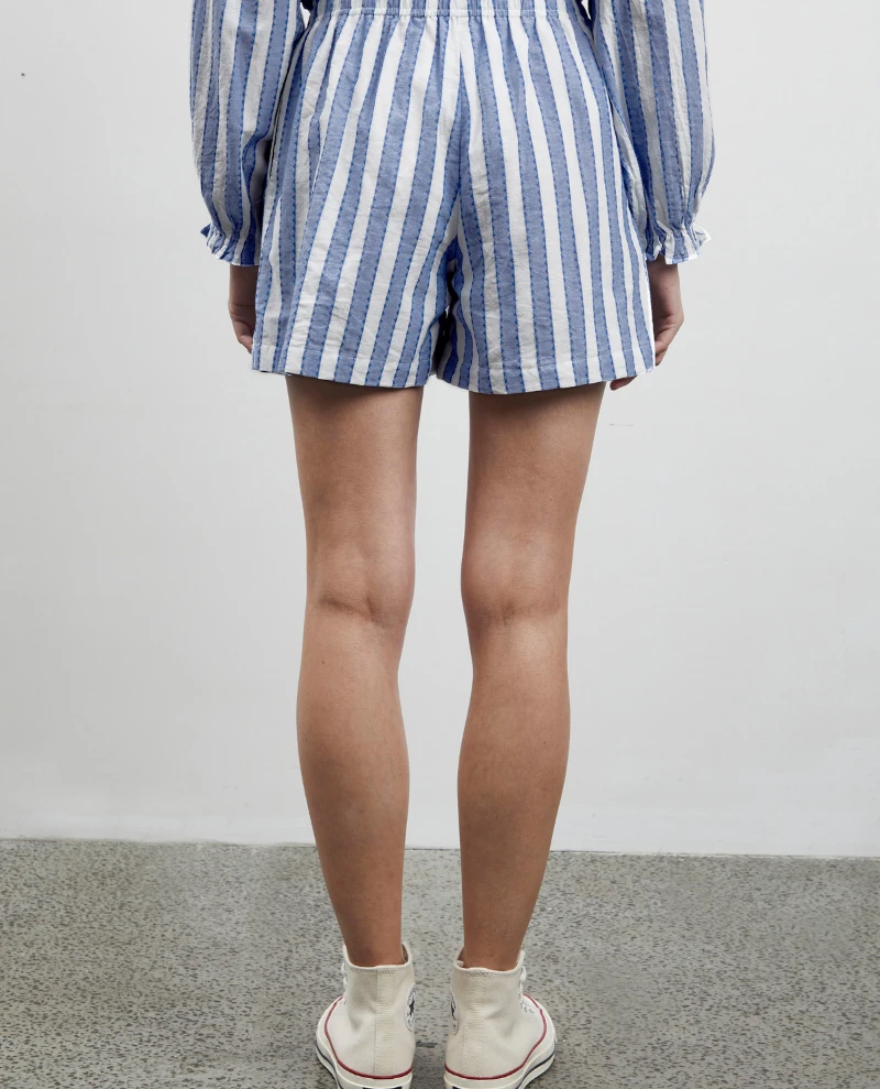 Ichi Ezoma Little Boy Blue Short, sodt cotton stripe shorts in white and blue. With elasticated waist, these are perfect for warmer weather or for lounging around the house. Pair with the matching Ezoma Shirt or Top for a co-ordinated look!