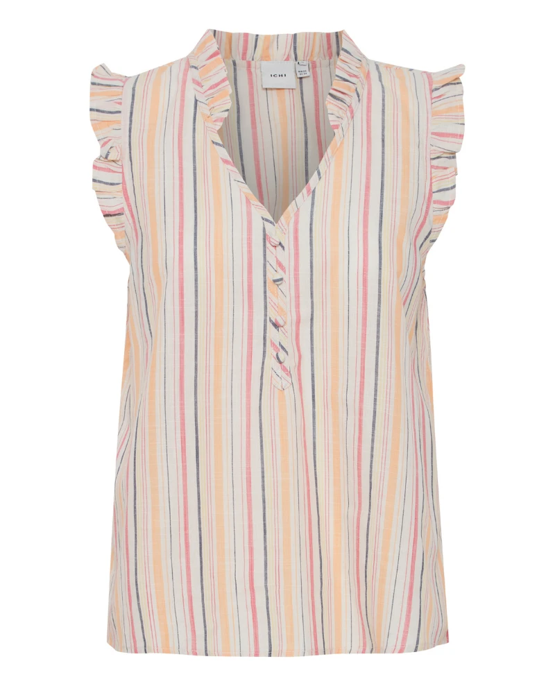 Ichi Gry Muskmelon Multicolour Top, a lovely lightweight sleeveless blouse with frill detail. Made from cotton, the Gry Muskmelon top has a v-neckline and a multicolour stripe finish.