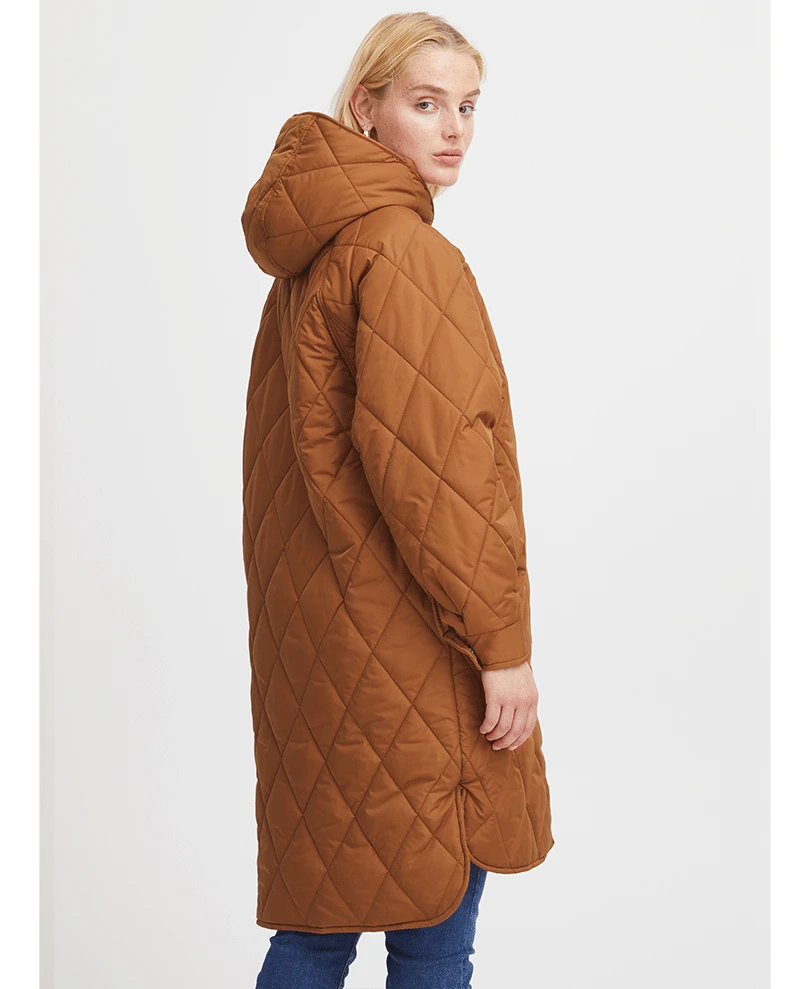 Ichi Hansa Argan Brown Jacket, a warm spicy brown diamond quilted jacket with long sleeves and a hood. Falling to the knee in length this padded Autumn coat has a longer hem at the back and popper fastenings down the front. Complete with two pockets and stud poppers on the cuffs the Hansa light shower resistant jacket has a slouchy fit.