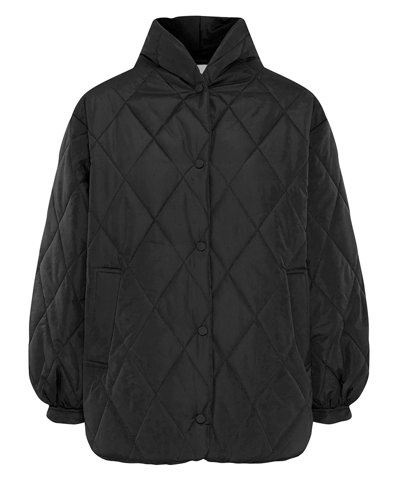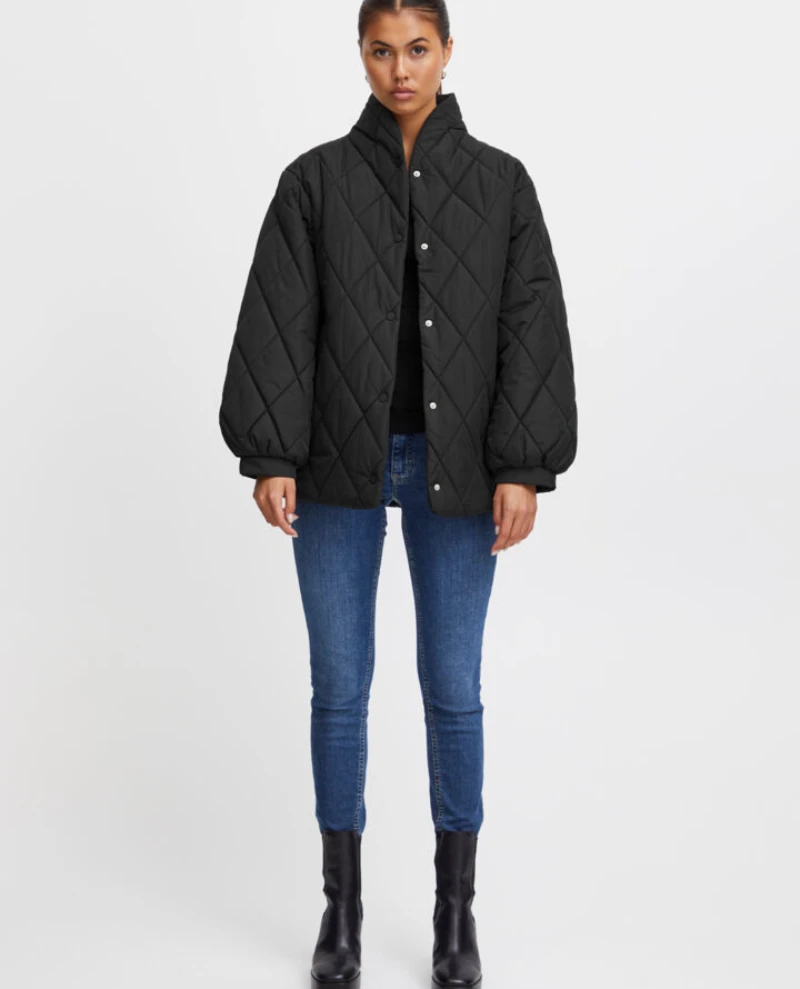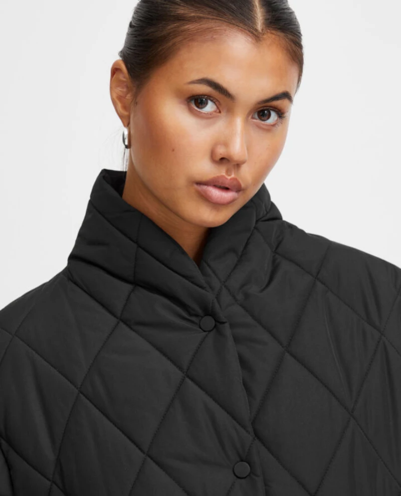 Ichi Hansa Short Black Jacket, a hip length black padded jacket with diamond quilt stitching and a stand collar. Fastening down the front with popper studs the Hansa coat has long sleeves and two pockets on the front. A lightweight coat which is perfect for keeping you dry in light showers in the new Autumn season.