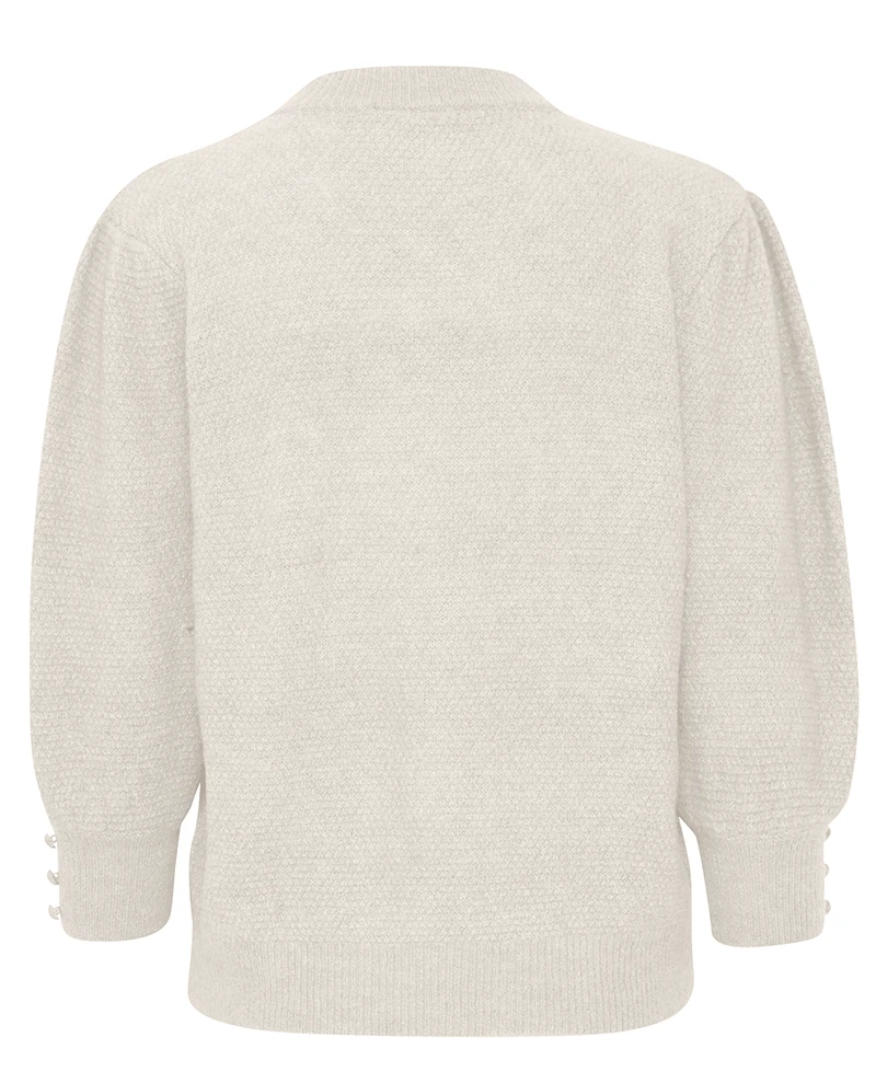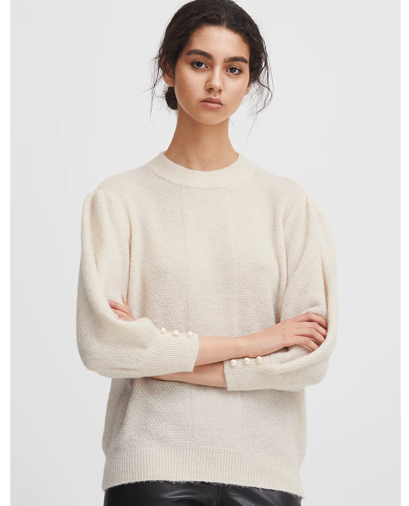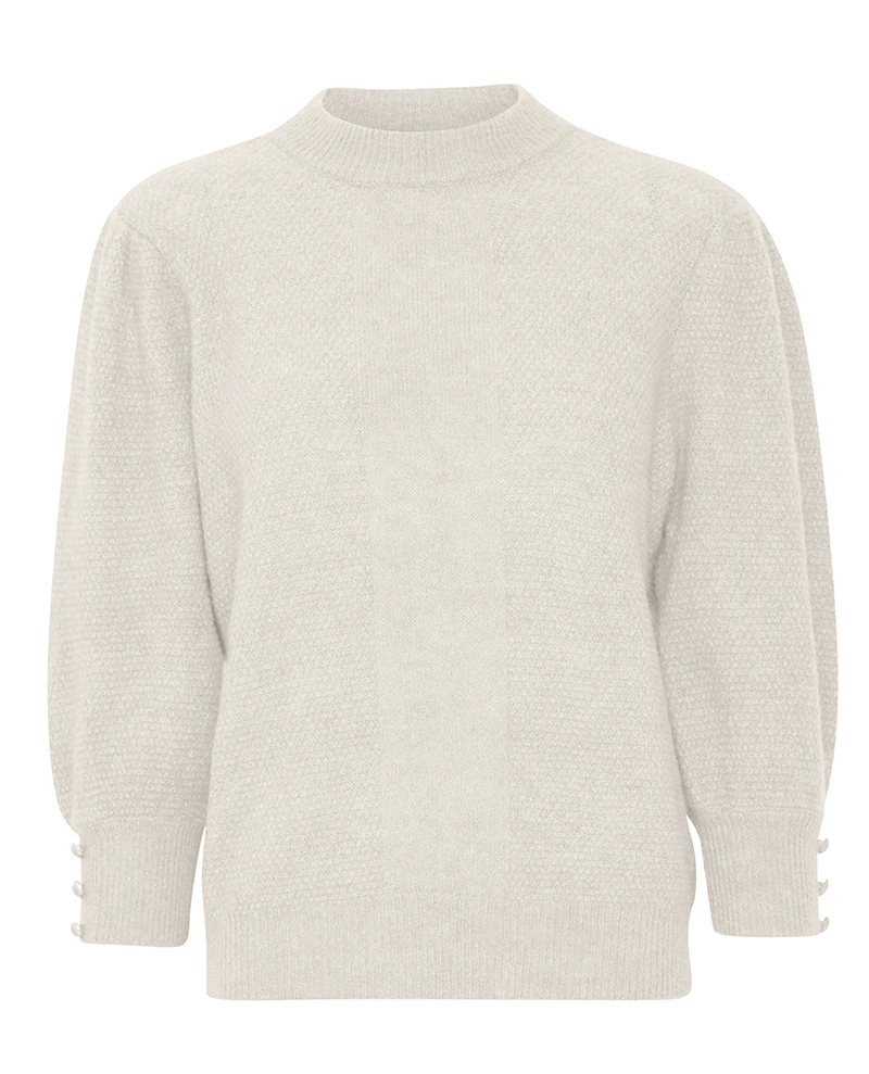 Ichi Kamara Cloud Knit, an off white knitted pullover with a round neck and 3/3 length sleeves.