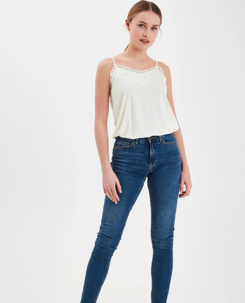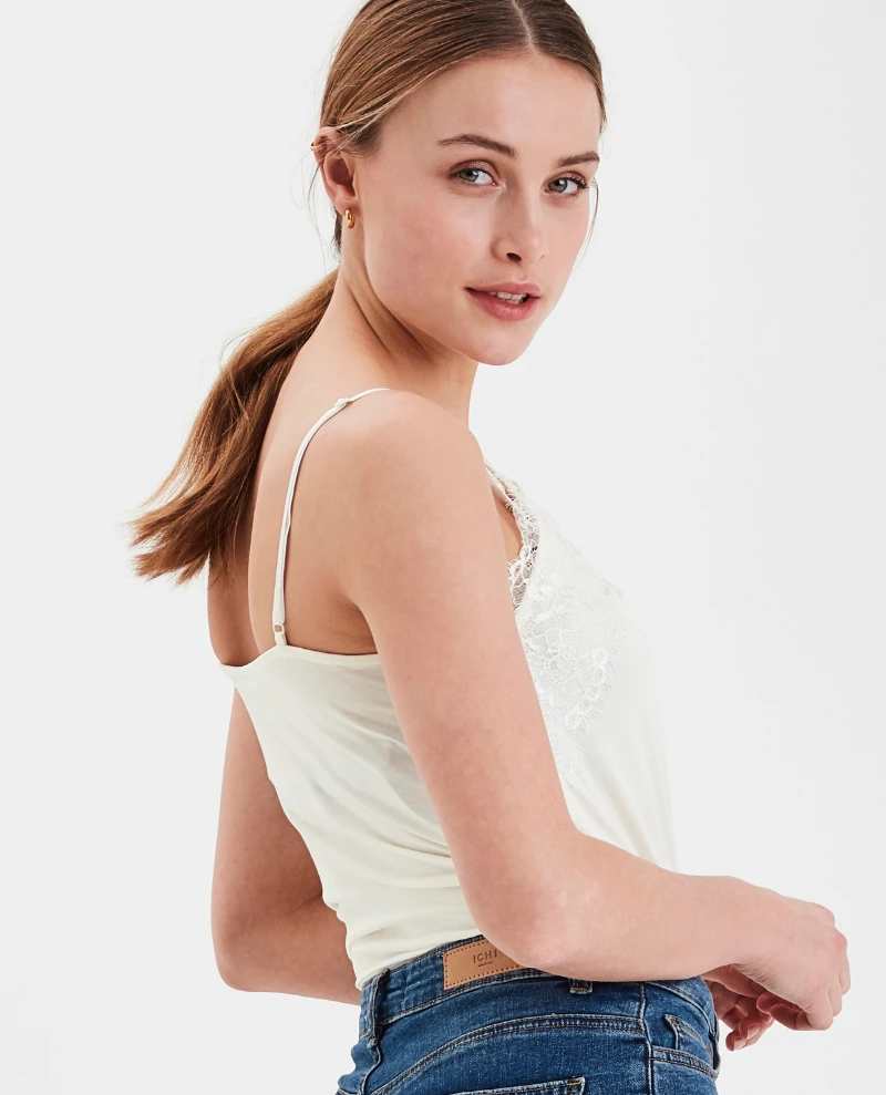 Ichi Like Cloud Dancer Top, a comfortable and lightweight camisole in neutral creamy white. Featuring detail lacing to the bust and slim straps, this is a versatile piece that can be layered beneath items year-round. Available in Pink and Black.