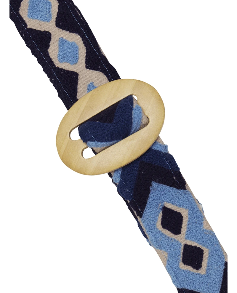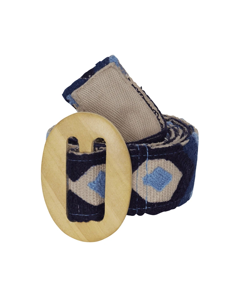 Ichi Nora Belt, a blue and navy textured fabric belt with a natural wooden fastening.
