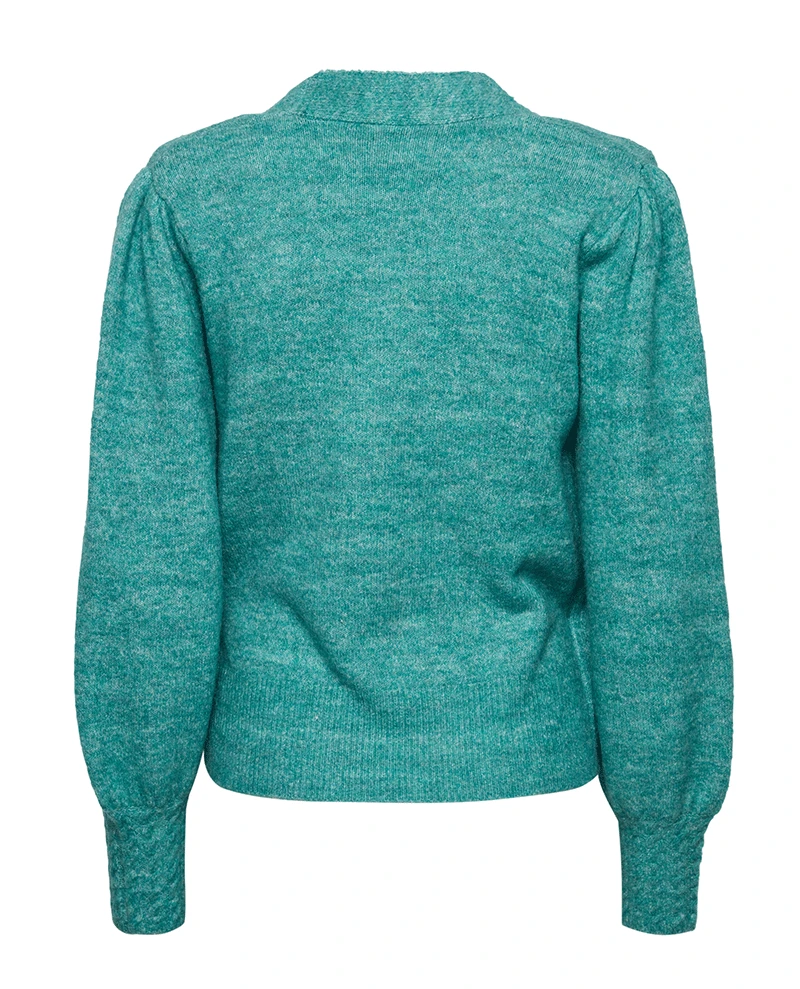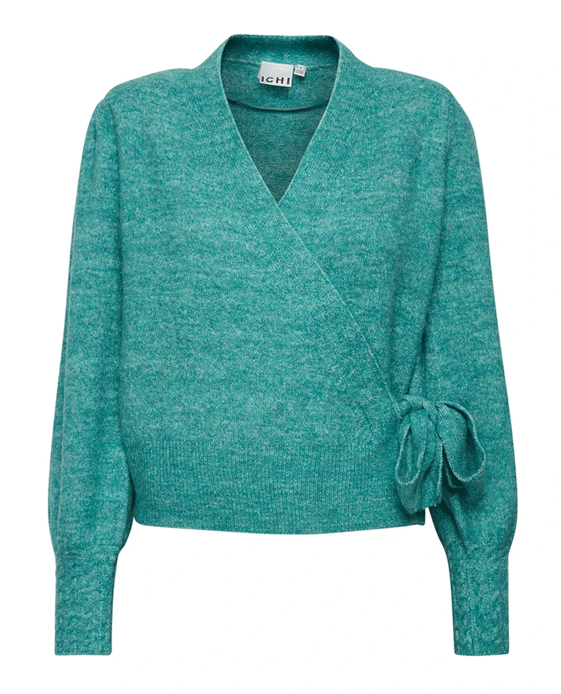 Ichi Olene Cadmium Green Cardigan, a bright greenish blue v neck cardigan with long balloons sleeves and a wrap around tie. Also available in lilac, the Olene cardigan has a relaxed fit.