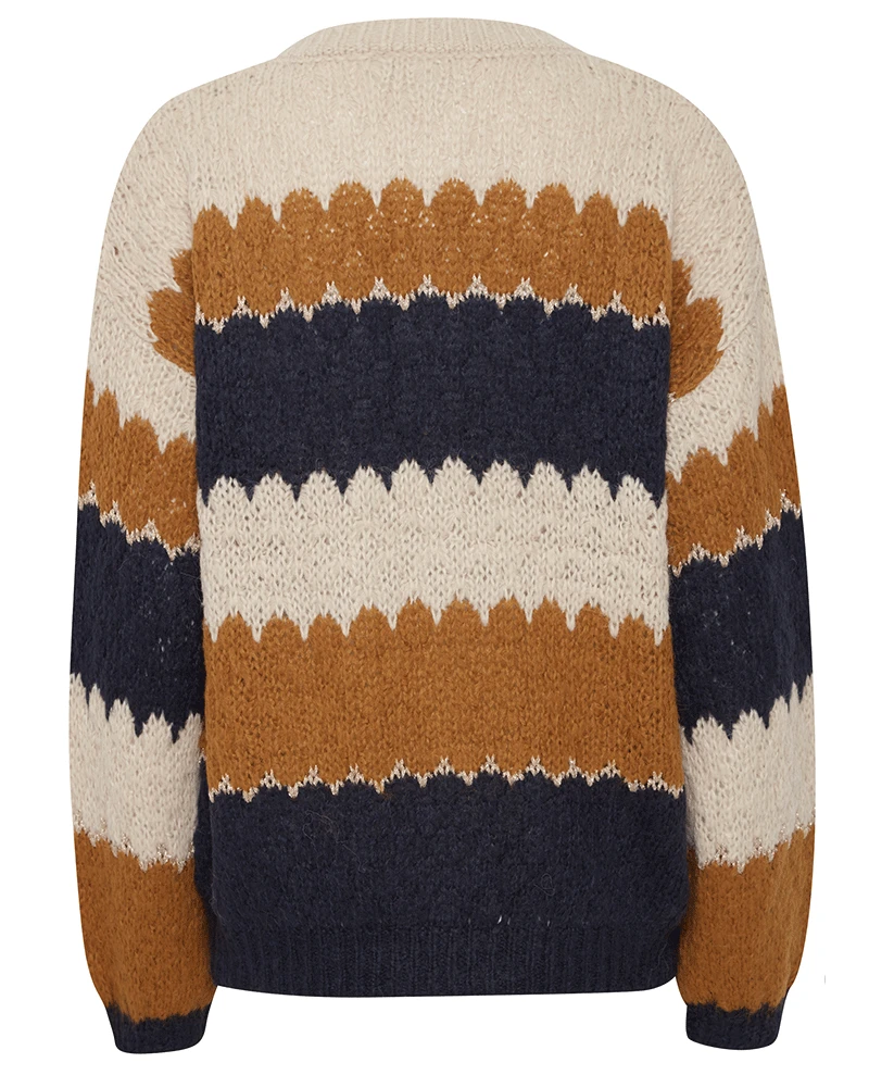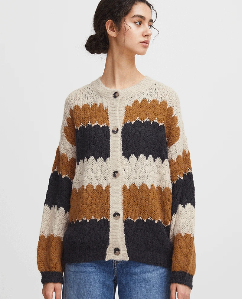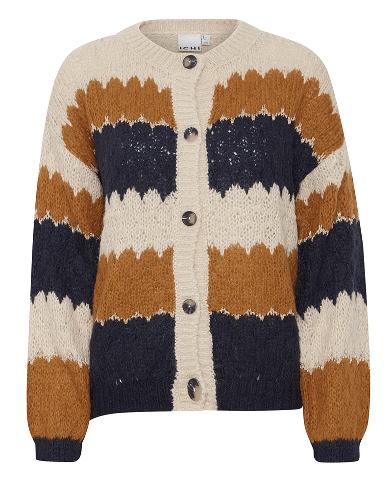 Ichi Osana Navy Cardigan, a slouchy and oversized striped cardigan with long sleeves, dropped shoulders and a round neck. Fastens down the front with brown buttons and features a gold sparkly stripe between the navy and brown scalloped stripes.
