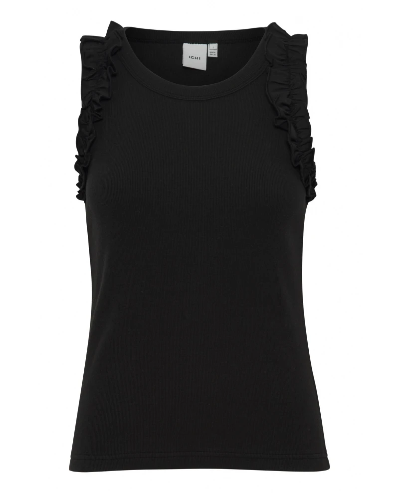 Ichi Paityn Black Top, a minimalist vest style top in deep, neutral black. With a rounded neckline and sleeveless finish, the Paityn is an easy top to layer or pair with jeans or linen. Finished with frill detail to the shoulders.