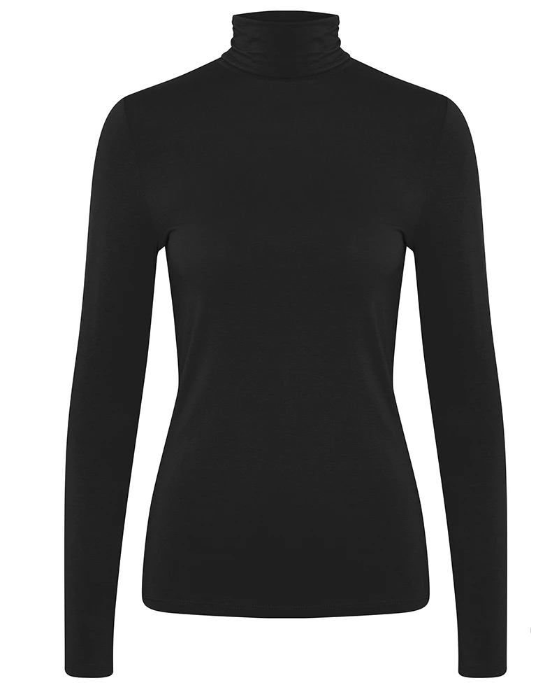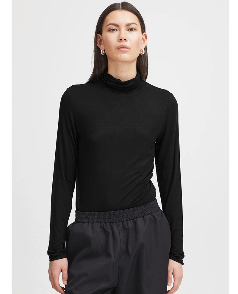 Ichi Philuca Black Rollneck Top, a basic black jersey tee with long sleeves and a polo neck.