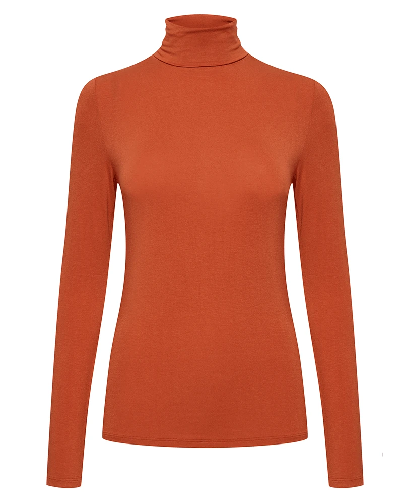 Ichi Philuca Rooibos Rollneck Top, a rust orange basic t-shirt with long sleeves and a high polo neck.Â