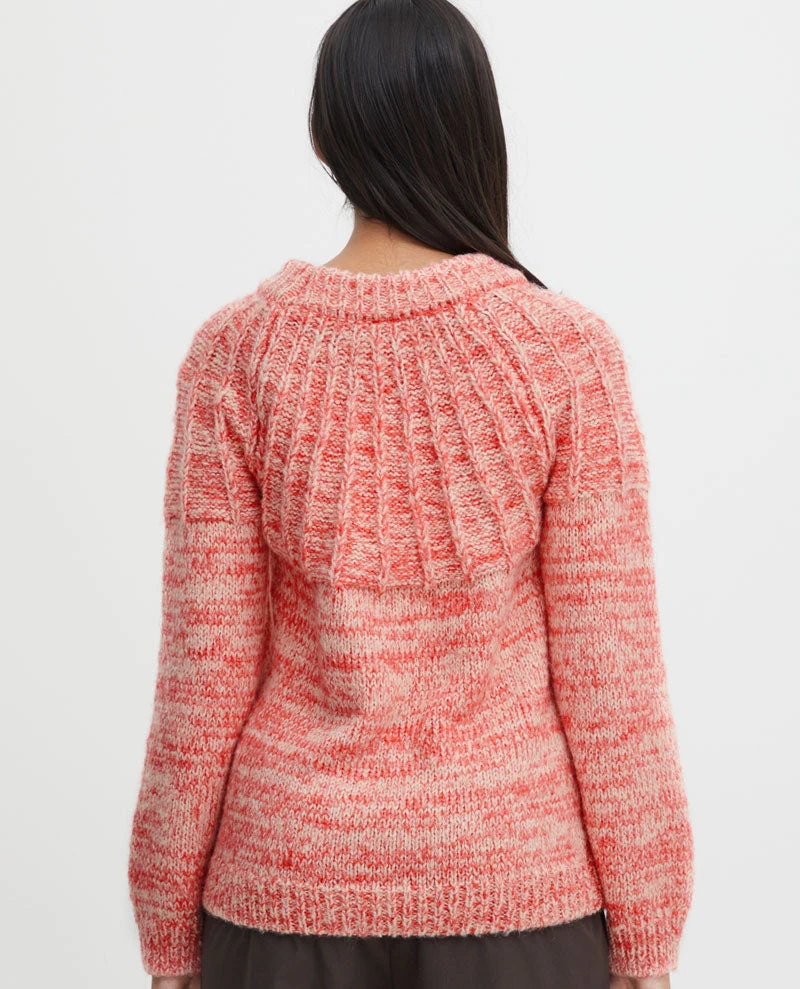 Ichi Poet Koi Marl Knit, a cosy knit in bright koi orange marl. With crewneck and long sleeves, the Poet knit has stitched ribbed detail to the front and back as well as ribbing on cuffs and neckline.
