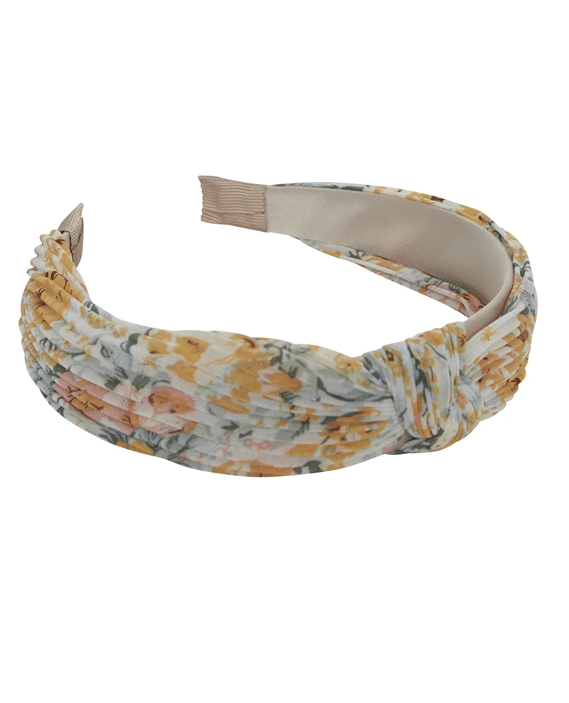 Ichi Tino Yellow Hairband, a yellow and green floral fabric covered headband with a knot on the front and a pleated effect. Also comes in blue.