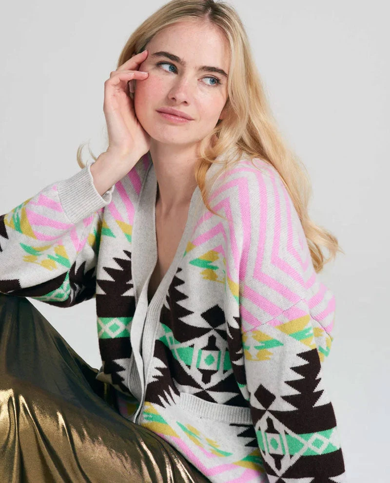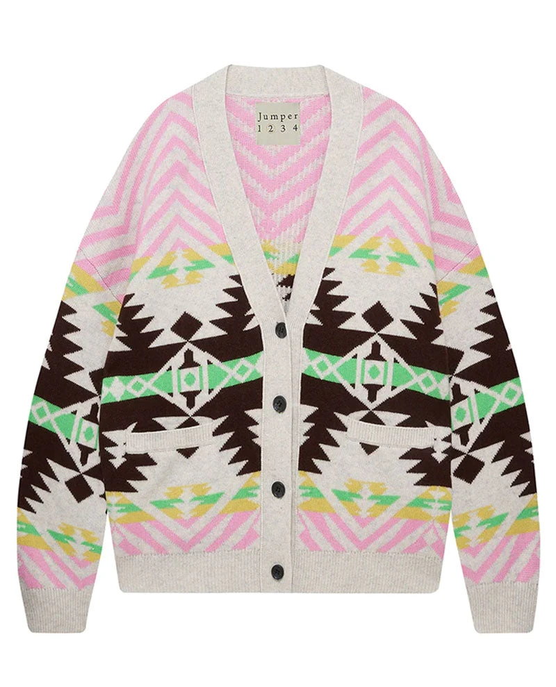 Jumper1234 Aztec Grey Cardigan, a heavyweight cashmere and wool mix knit. With deep v-neck and all over Aztec inspired jacquard pattern in multicolour with pale grey ribbing. Designed to have an oversized fit.