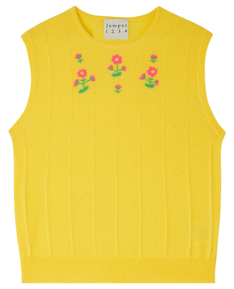 Jumper1234 Flower Bright Yellow Cashmere Tank, stand out from the crowd in this bright yellow vest. With a classic fit and short sleeves, this is finished with sweet embroidery detail to the chest.