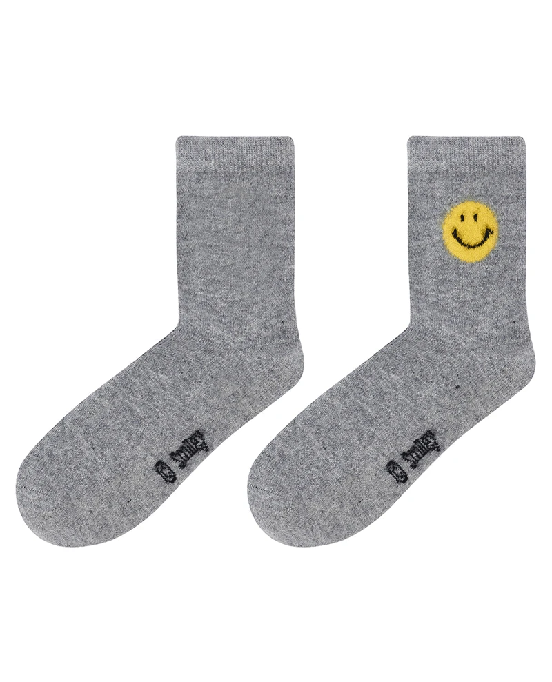 Jumper1234 Smiley Grey Socks, a soft pair of knitted grey cashmere bed socks with yellow and black smiley emojis on ankles. Cosy for wearing at home these knitted socks have added stretch for comfort.