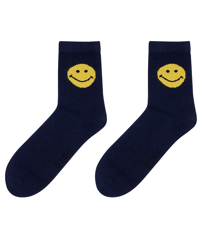 Jumper1234 Smiley Navy Socks, a soft pair of knitted navy blue cashmere bed socks with yellow and black smiley emojis on ankles. Cosy for wearing at home these knitted socks have added stretch for comfort.
