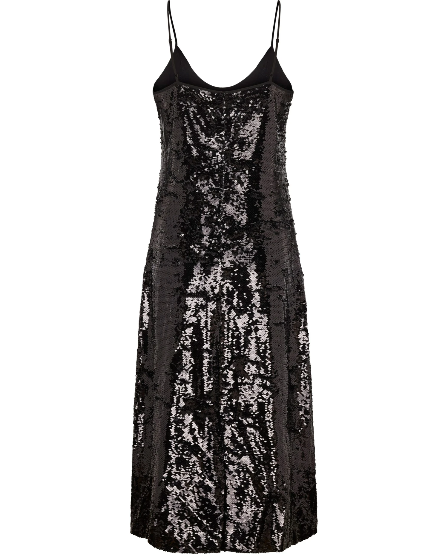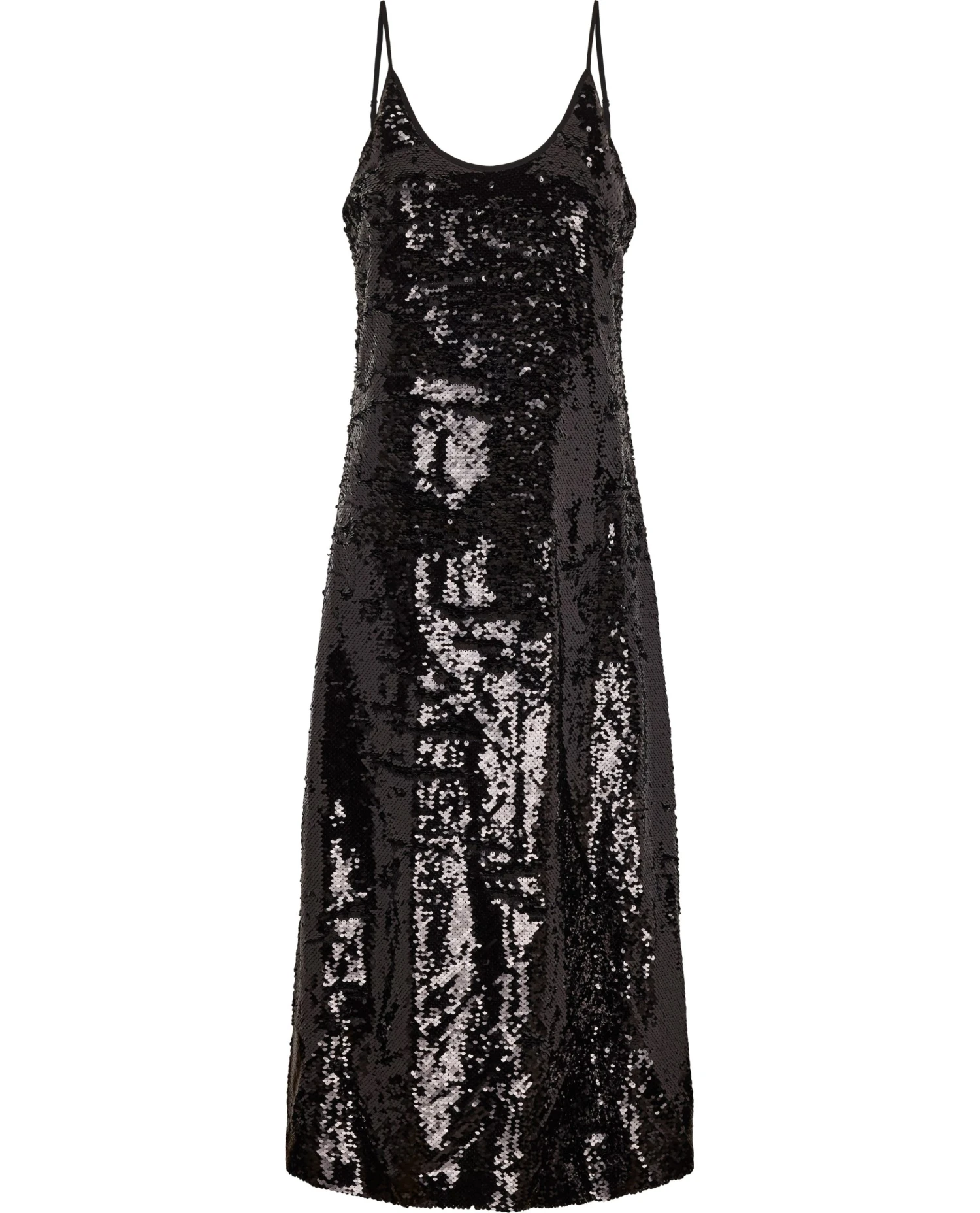 Just Female Xena Black Dress, a black sequin midi dress with a round neck and thin straps. This heavily embellished black sequin dress has adjustable straps and a zip at the back.Â