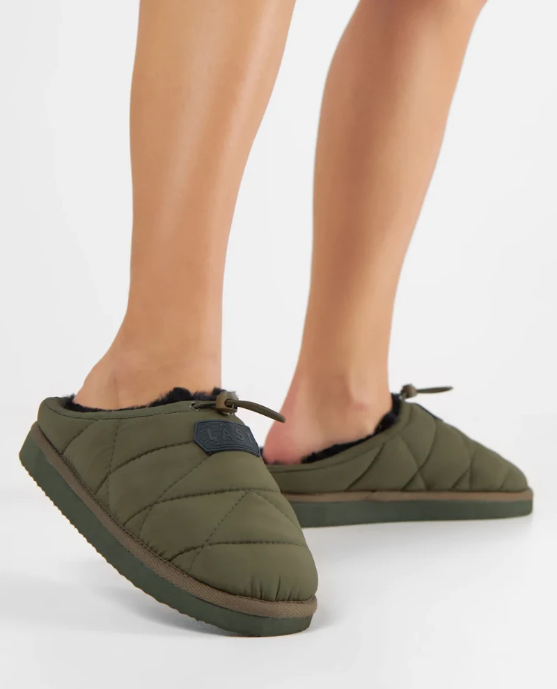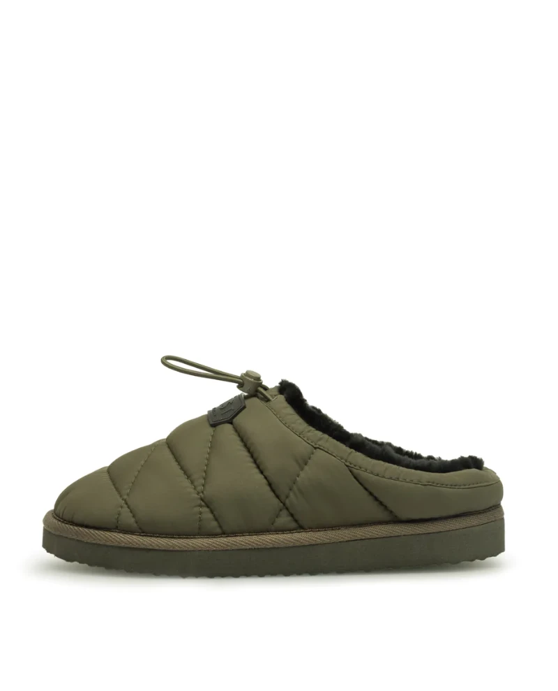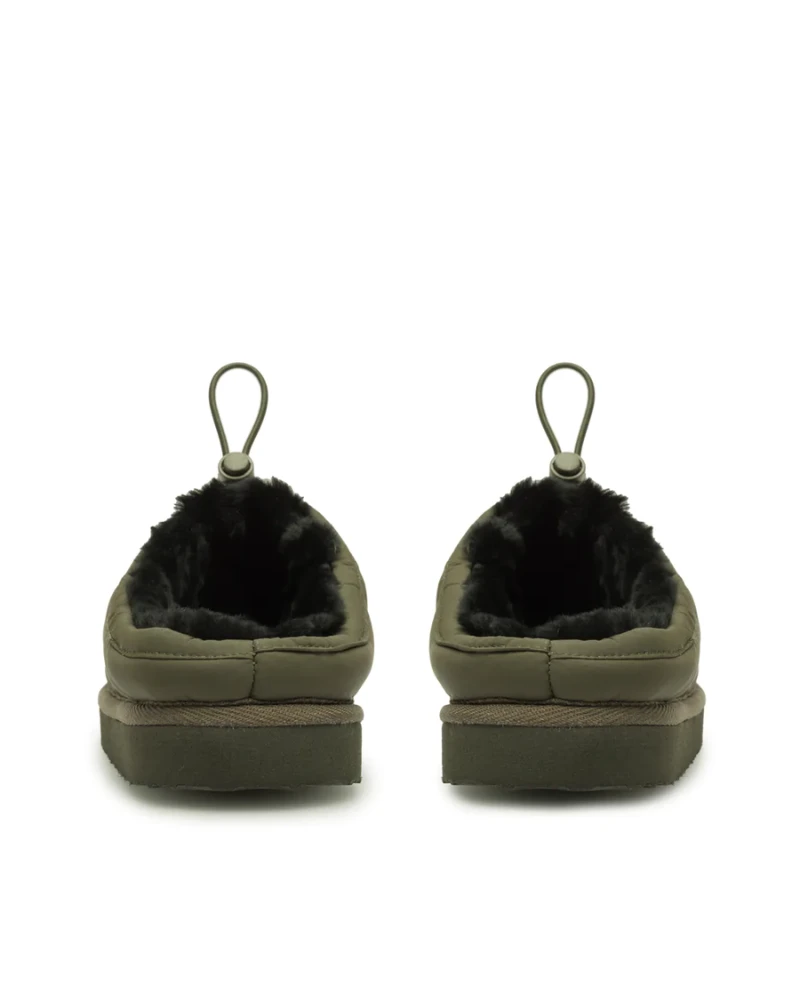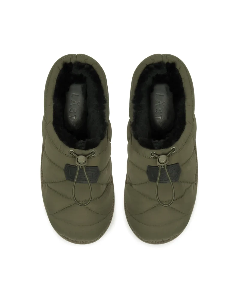 Last Amelia Olive Shoe, a fashionable and unique slipper style shoe. Available in olive and orange, the Amelia has a quilted upper with 100% wool shearling lining and drawstring to adjust to the foot. Finished with a LÄST logo rubber patch at upper front and grossgrain tape around outer sole edge for a clean finish. Outersole is EVA with a structured pattern at bottom.