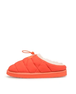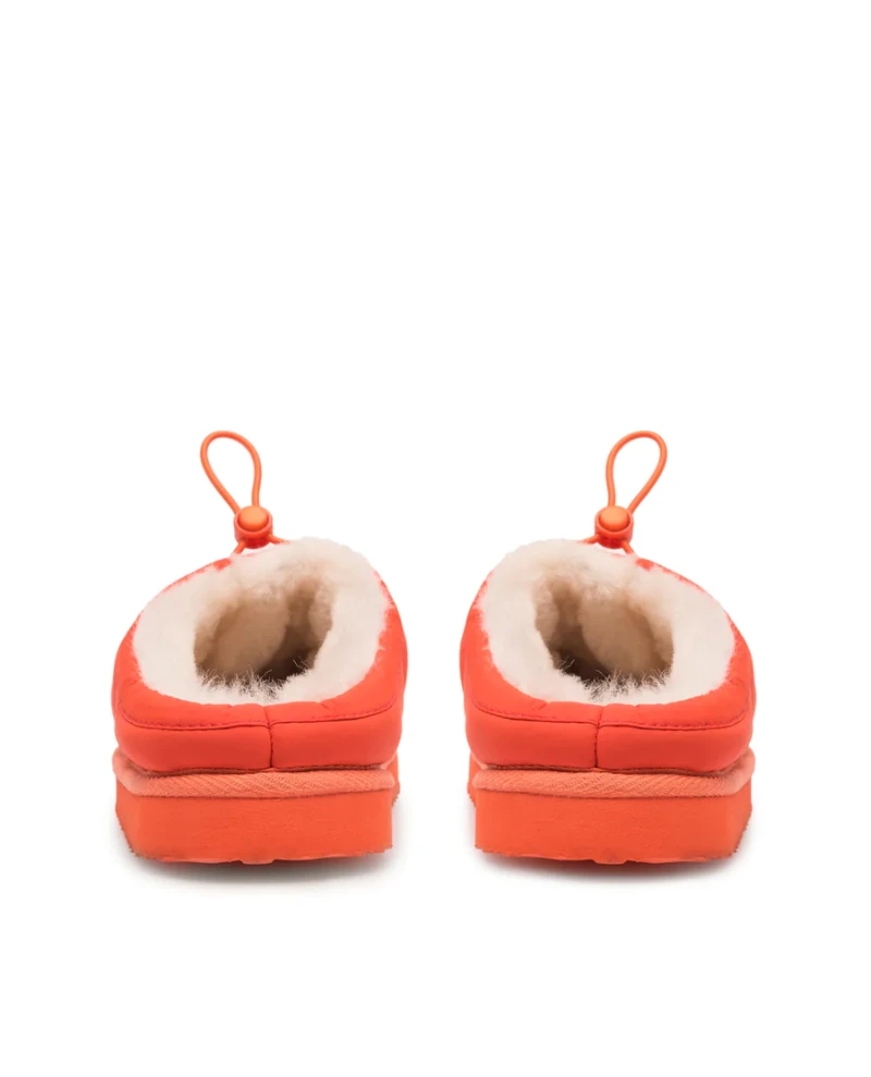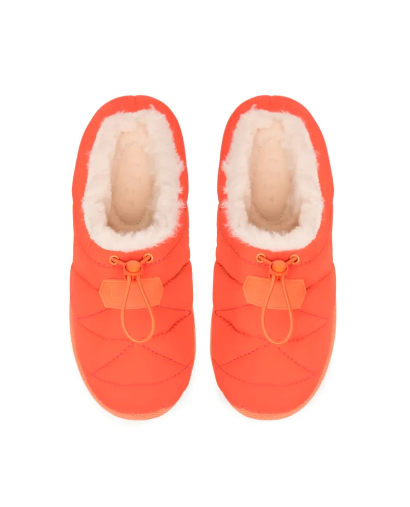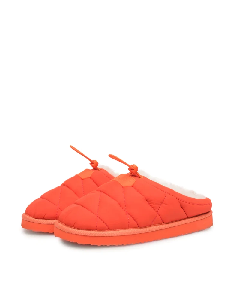 Last Amelia Orange Shoe, a fashionable and unique slipper style shoe. Available in olive and orange, the Amelia has a quilted upper with 100% wool shearling lining and drawstring to adjust to the foot. Finished with a LÄST logo rubber patch at upper front and grossgrain tape around outer sole edge for a clean finish. Outersole is EVA with a structured pattern at bottom.