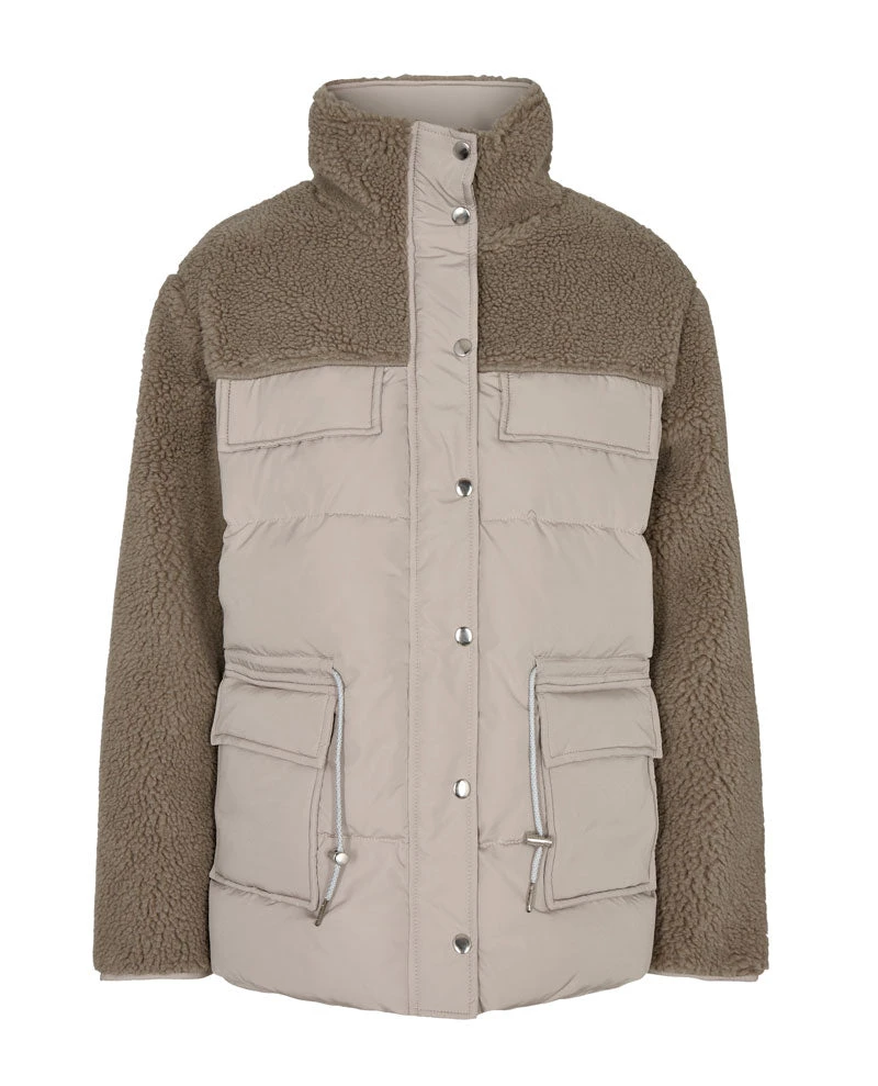 Levete Room Oxana Jacket, a neutral puffer jacket with contrasting shearling to the arms as well as the collar and back panels. With pockets to either side, the Oxana is finished with classic zip and button closure.