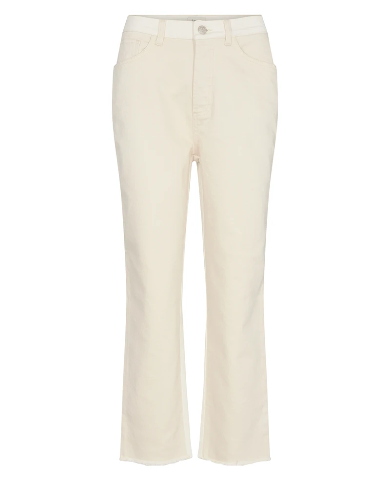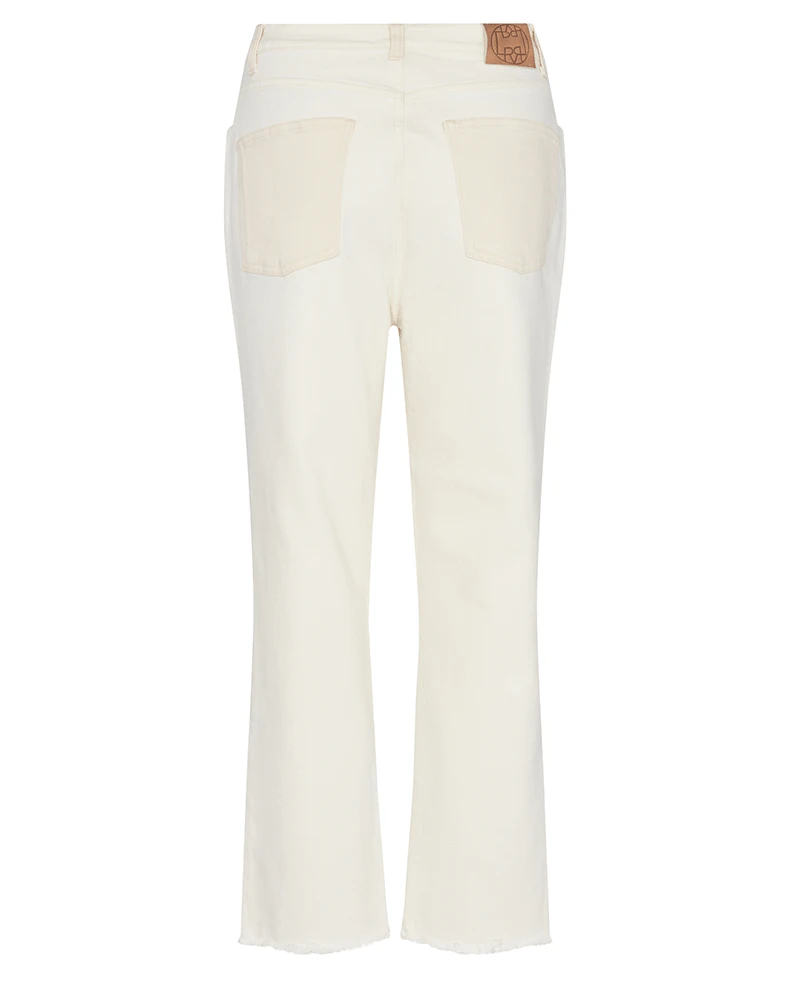 Levete Room Ramella Trousers, a two tone cream and white pair of denim jeans with a straight leg and a high waist. Cream on the front and white on the back with a contracted waistband these Spring jeans are cropped at the ankle with pockets and belt loops.