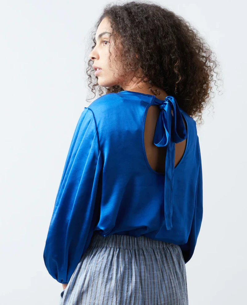 Lollys Laundry Bergen Blue Blouse, a striking blue blouse with voluminous sleeves. In a silky finish, the Bergen blouse has a cut out back and tie to the back of the neck.