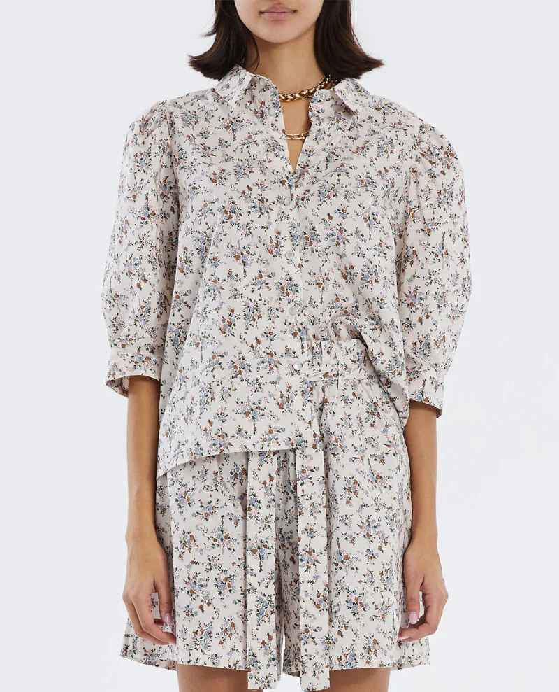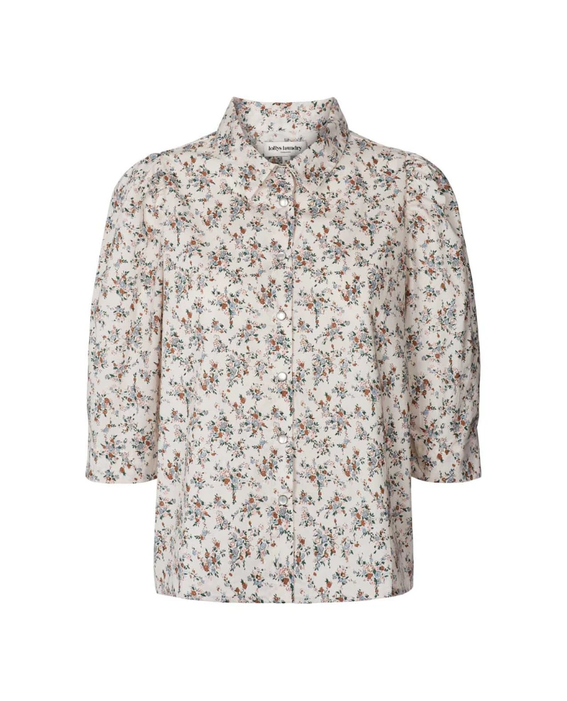 Lollys Laundry Bono Flower Print Shirt, a button down shirt in neutral tone with contrasting floral pattern. Complete with half sleeves and collar, we love this styled with skirt or denim and trainers.