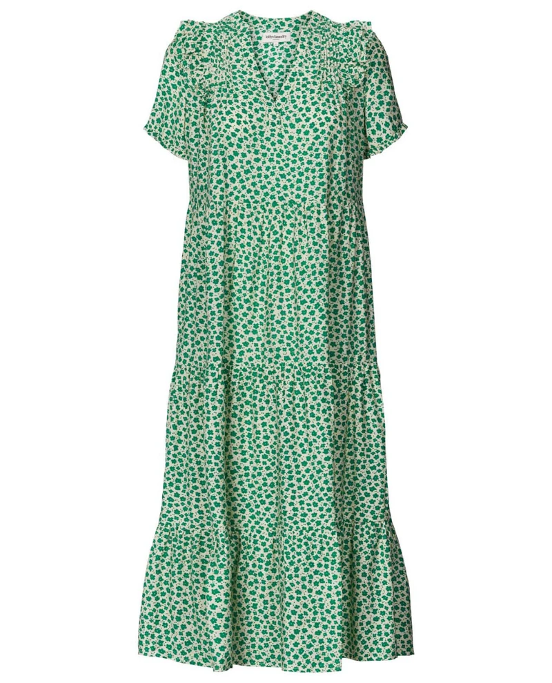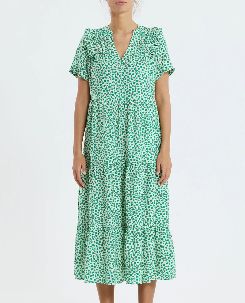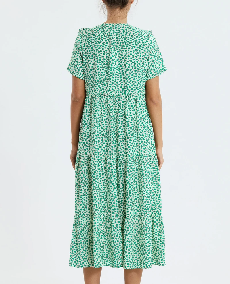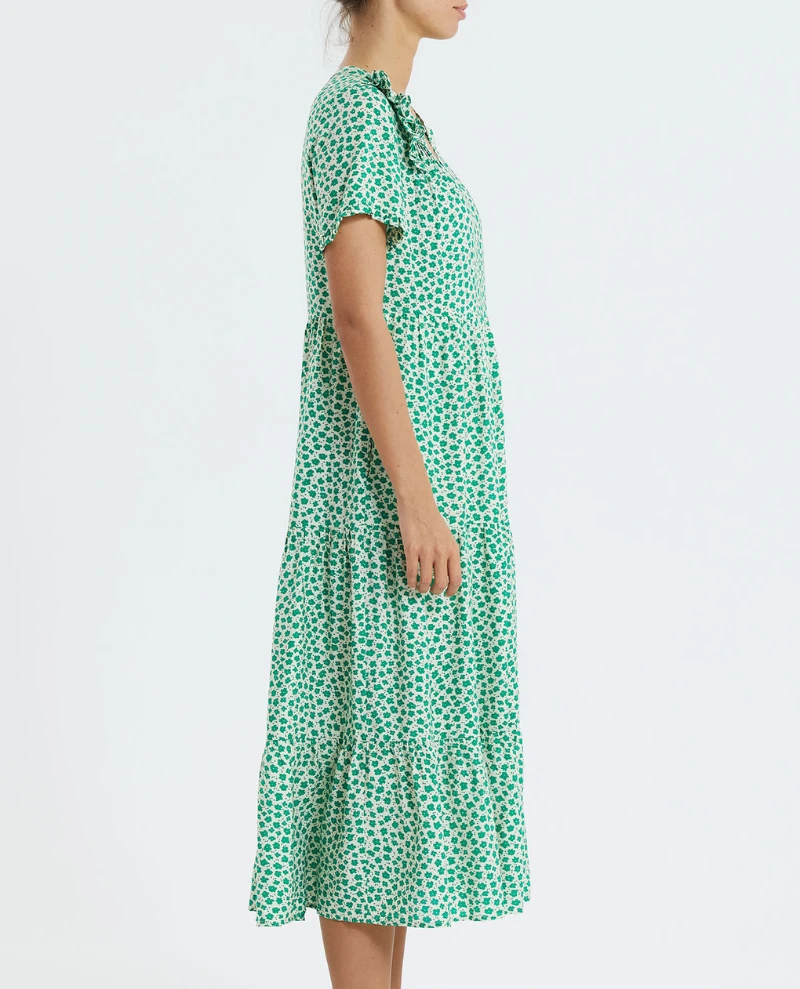Lollys Laundry Freddy Flower Print Dress, a green and white tiered dress with a relaxed and casual fit. With a v-neckline, the Freddy has subtle frill details and short sleeves for ease of movement. The perfect summer dress, pair with trainers or sandals for a comfortable look.
