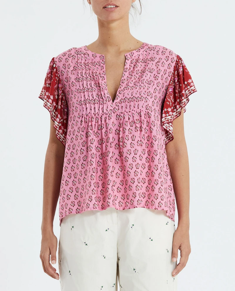 Lollys Laundry Isabel Pink Top, an elegant blouse with short, frill sleeves. In pink and red, the Isabel top is the perfect pairing for trousers, skirts and jeans. Designed with a v-neckline and pleating to the chest, the Isabel has a true to size fit with slightly longer back than front.
