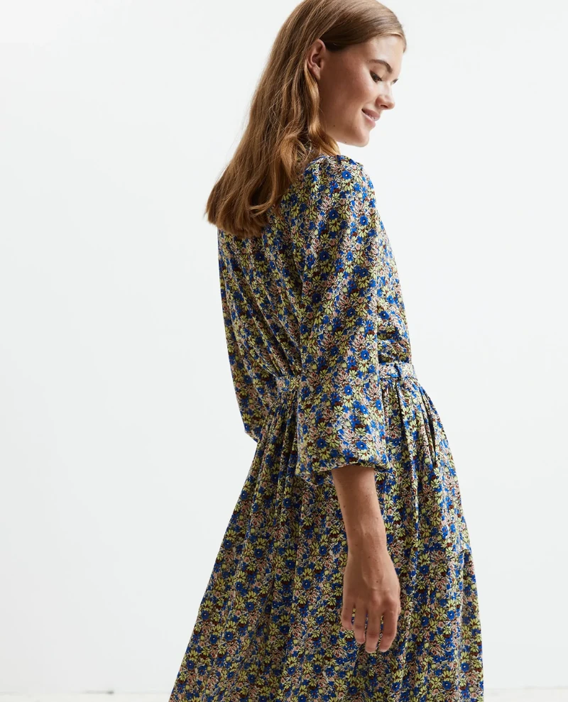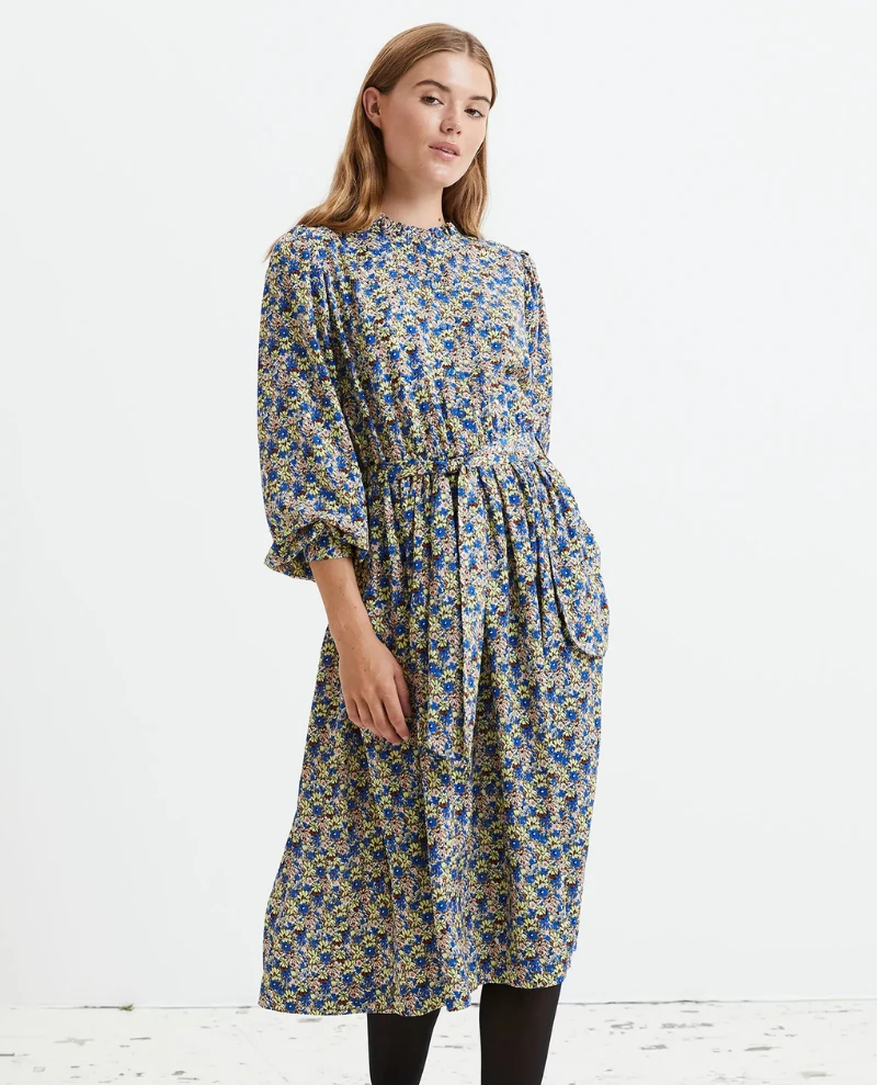 Lollys Laundry Karlo Dress, a stylish floral dress in a midi length, with long sleeves, pockets and front placket opening to waist. The elastic waist and frill details give this Karlo dress a feminine edge.