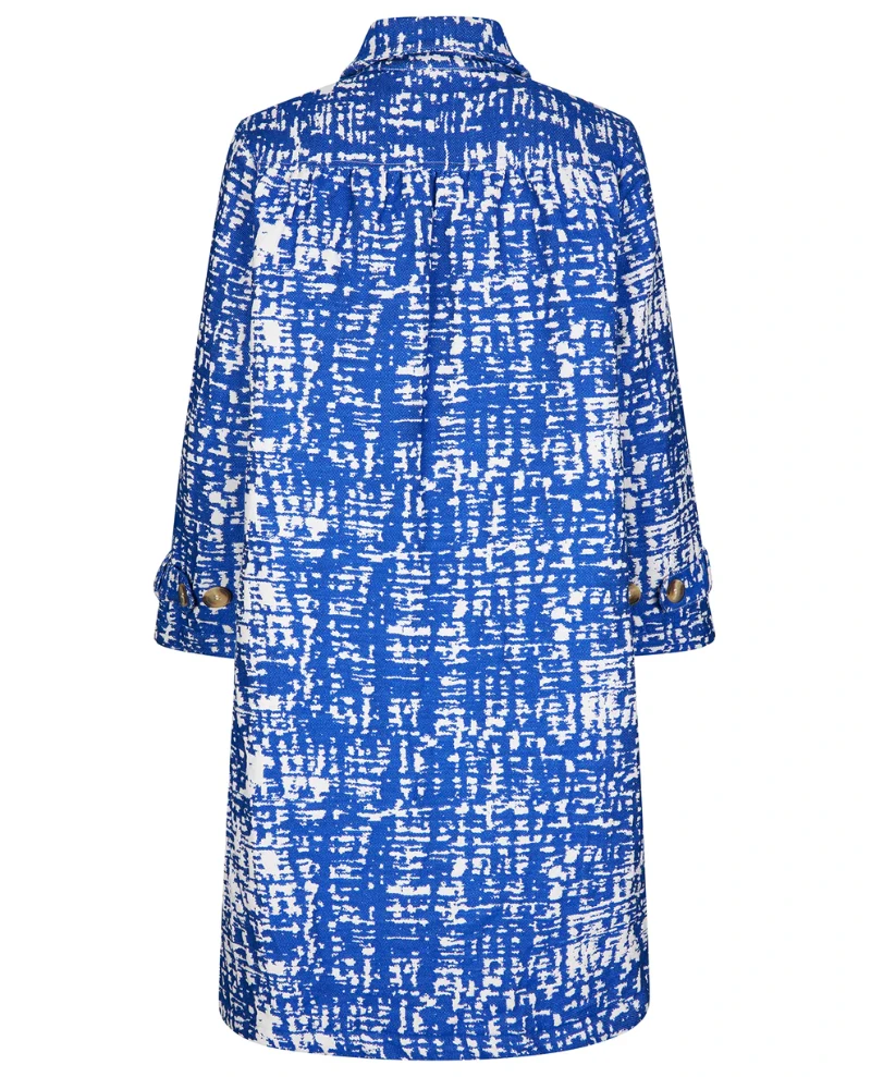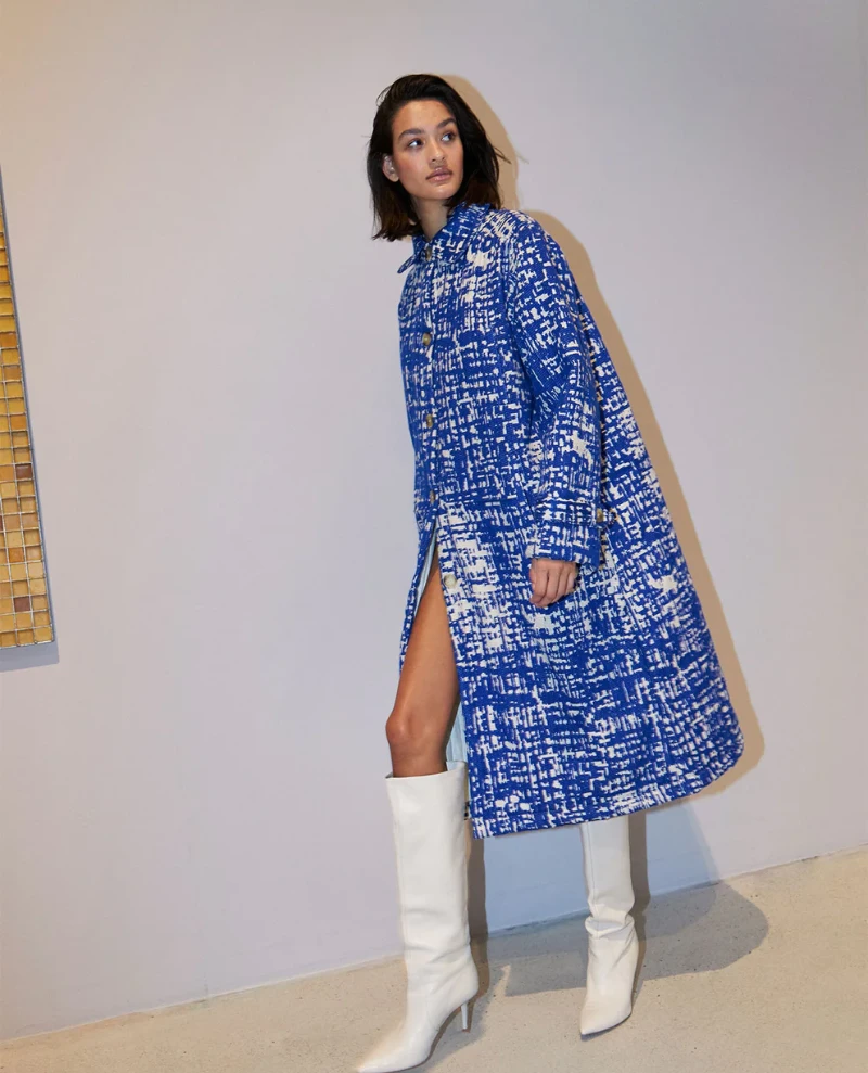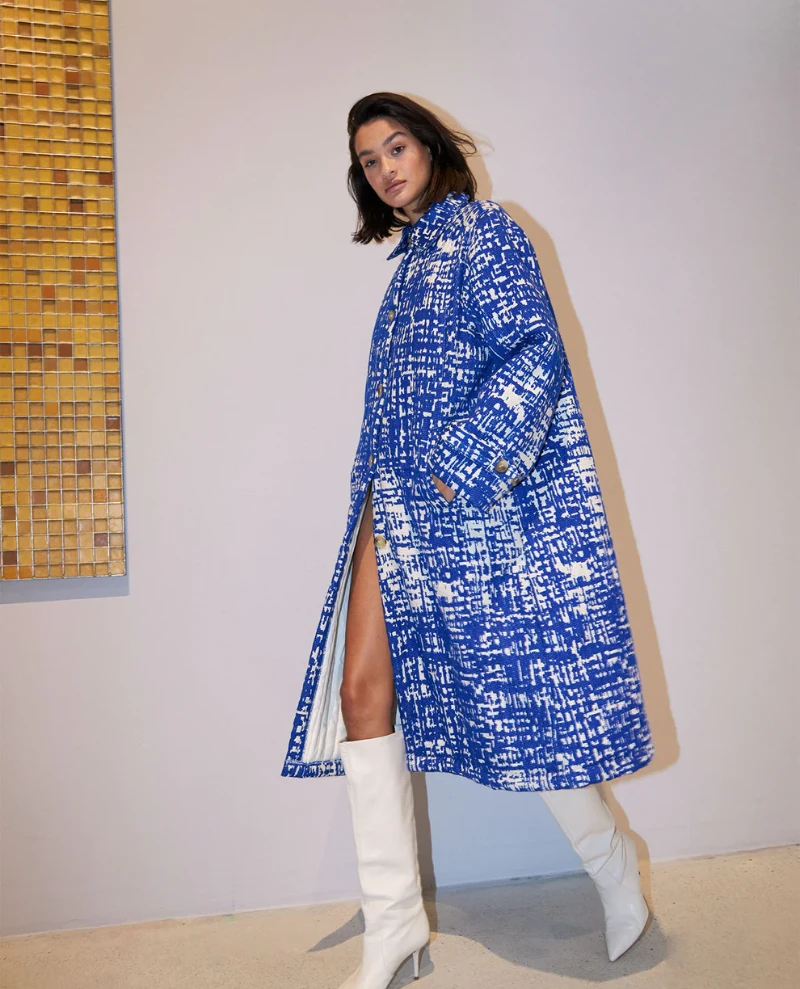 Make a statement with the Mikala Blue Jacket from Lollys Laundry. This long jacket features front button closure, adjustable cuffs, classic collar, and side pockets for a modern, sophisticated look. Crafted with a cotton and acrylic blend, this piece is designed to be worn with a bit of an oversized fit and elegant print of blue and white. Keep cool and look amazing with Lollys Laundry.