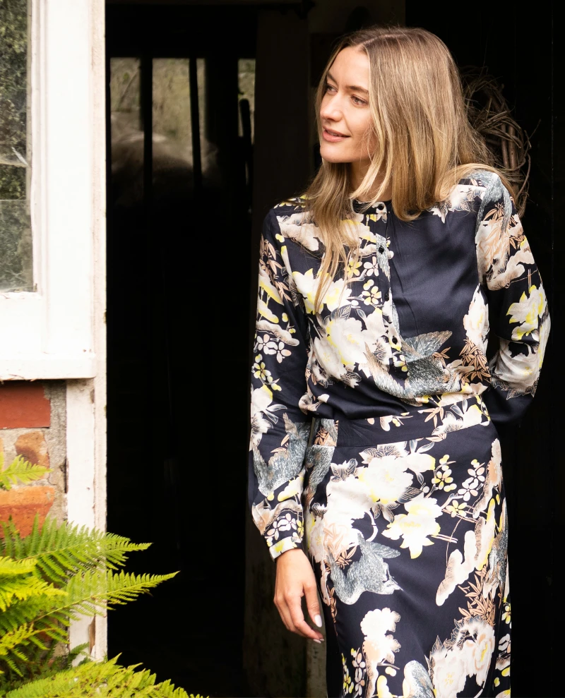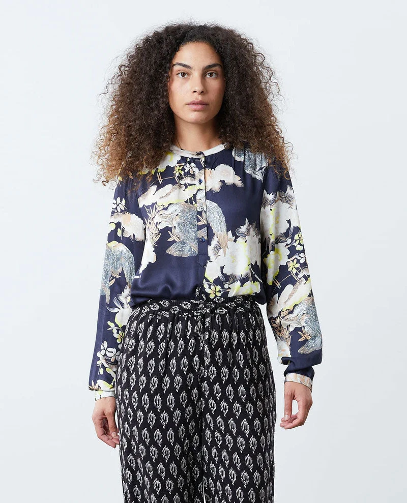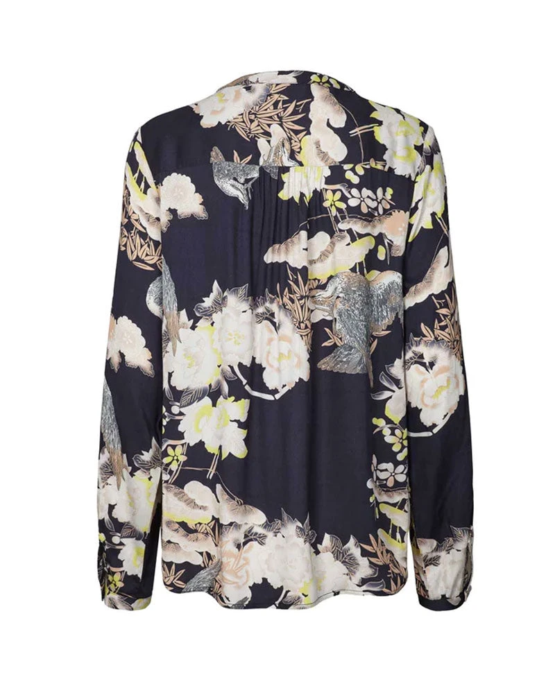 Lollys Laundry Singh Navy Shirt, a classic shirt with bold printed detailing. Finished with a round neckline and long sleeves, the Sigh shirt has a placket opening to front and a flattering yoke to the back with a comfortable fit. Slightly longer in the front than the back, this is a must-have this season.